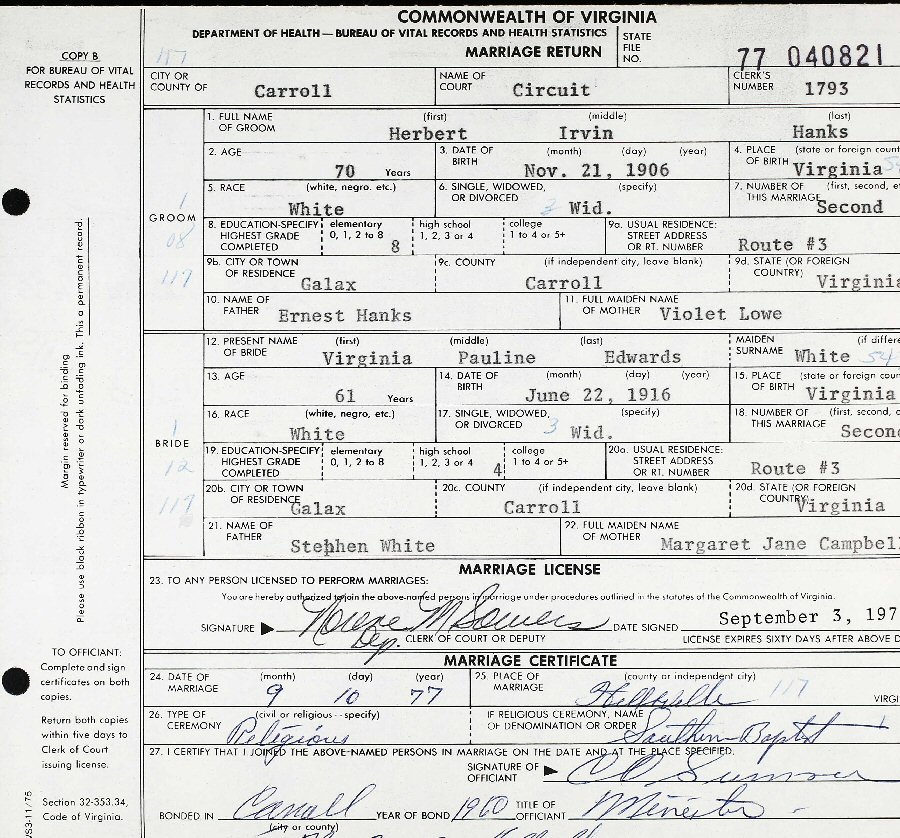 (2) Herbert Irvin Hanks September 10, 1977 in Carroll County, Virginia.