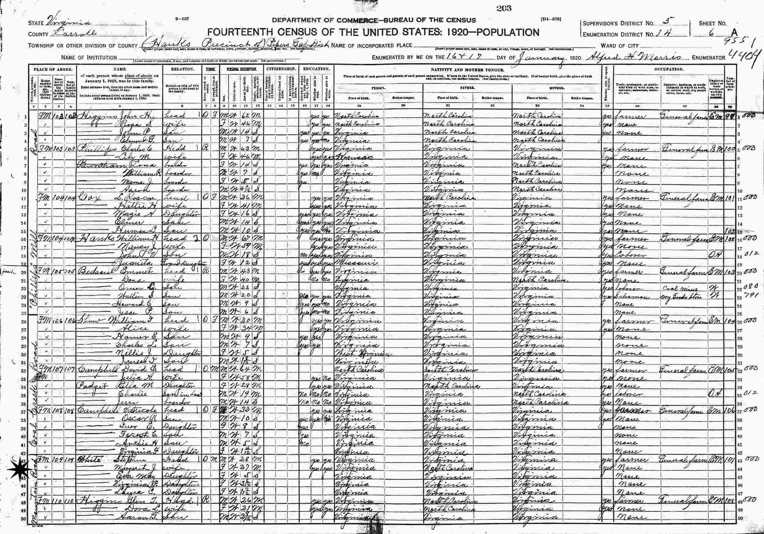 January 16-17, 1920 - Mountain Road, Supervisor's District 5, Enumeration District 14, Hanks Precinct, Pipers Gap District, Carroll County, Virginia.