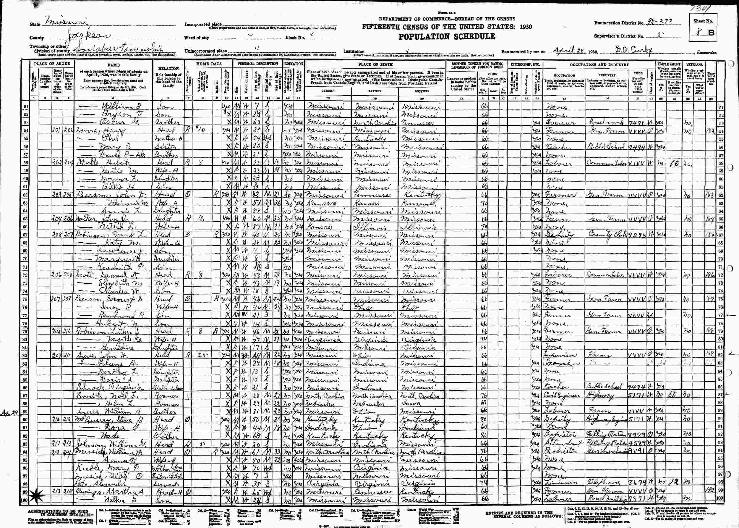 April 29, 1930 - Supervisor's District 5, Enumeration District 48-27, Sniabar Township, Lafayette County, Missouri.