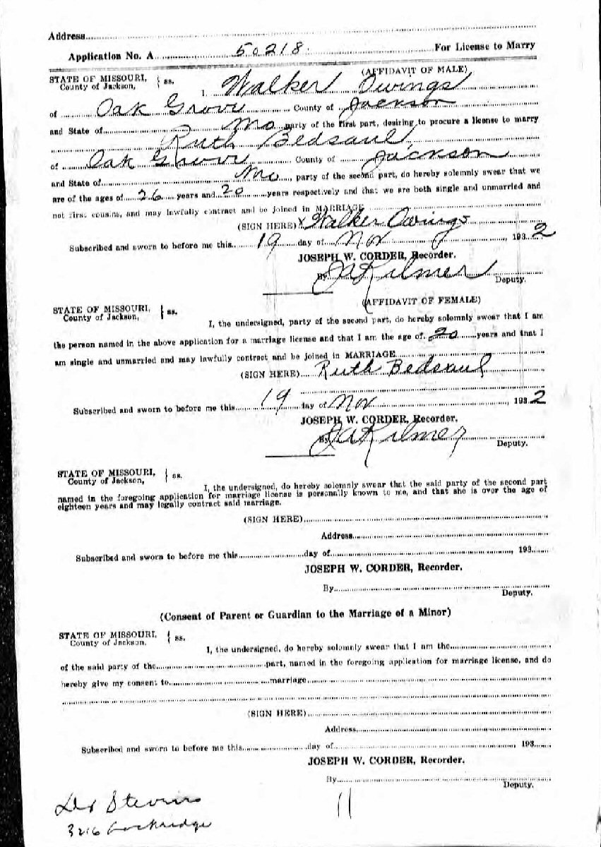 Married: Ruth Aline Bedsaul November 29, 1932 in Kansas City, Jackson County, Missouri.