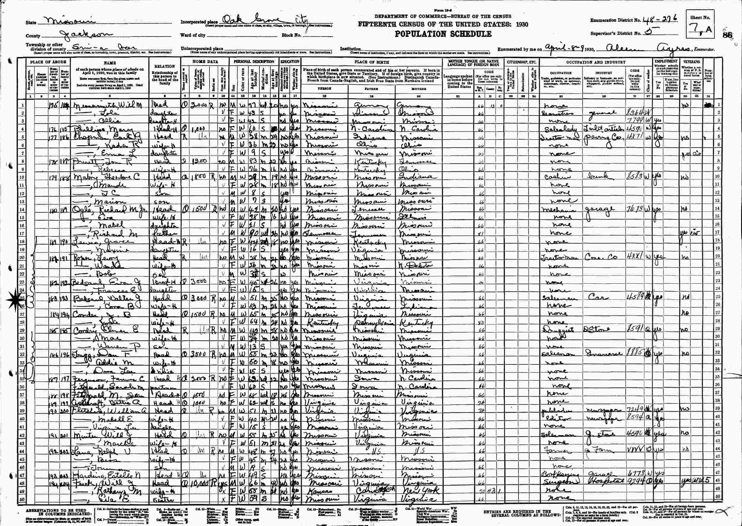 April 8-9, 1930 - Dow Avenue, Supervisor's District 5, Enumeration District 48-276, Sinabar, Oak Grove City, Jackson County, Missouri.