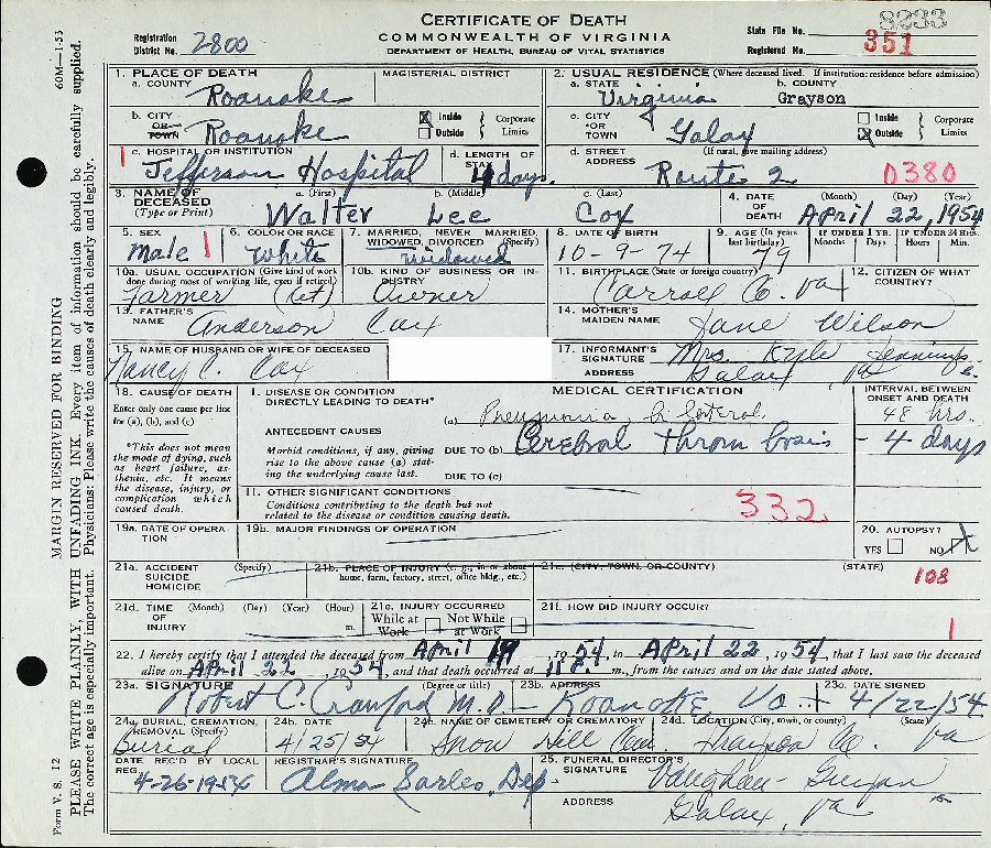 Died: April 27, 1954 in Jefferson Hospital, Roanoke, Virginia.