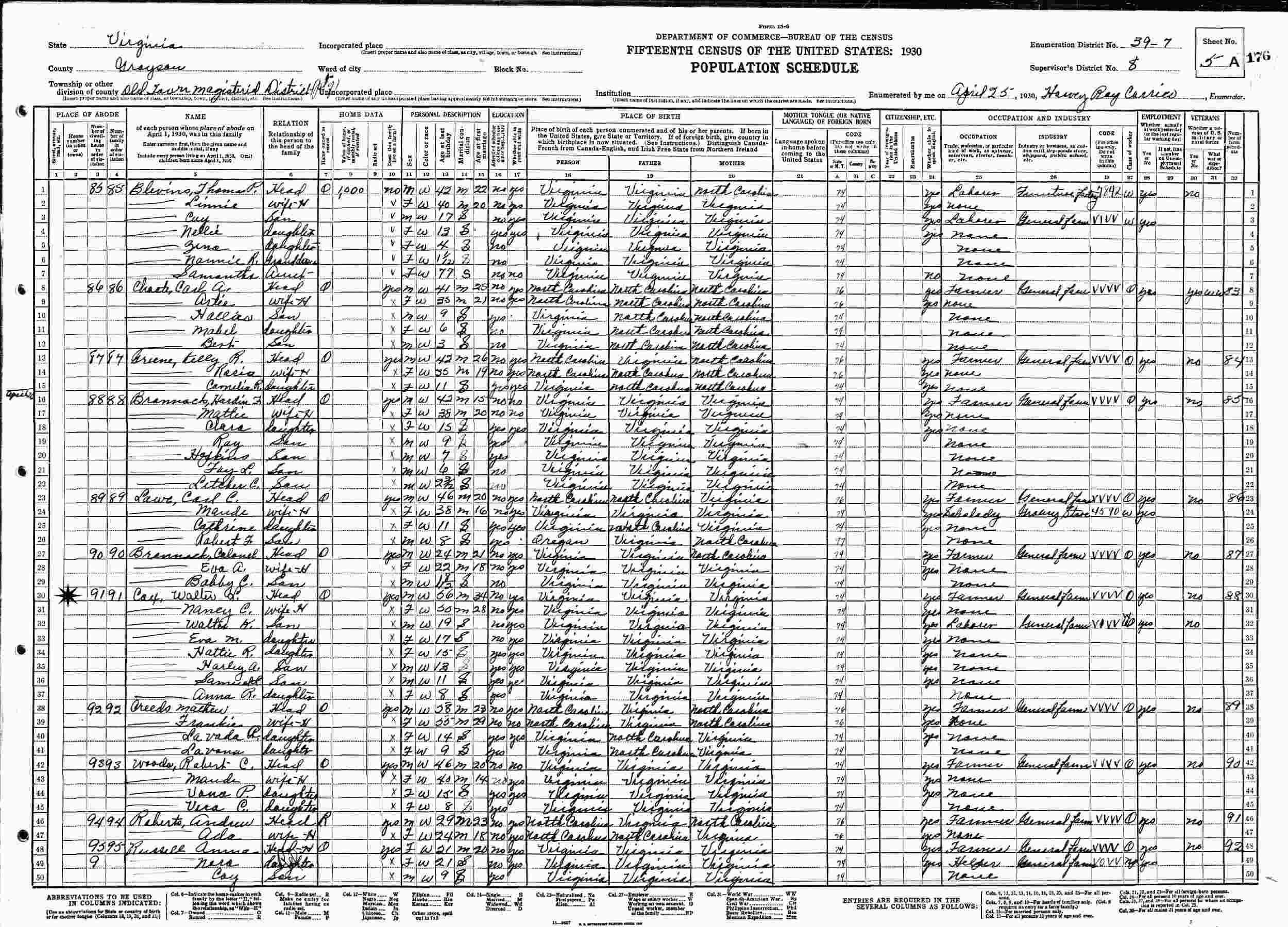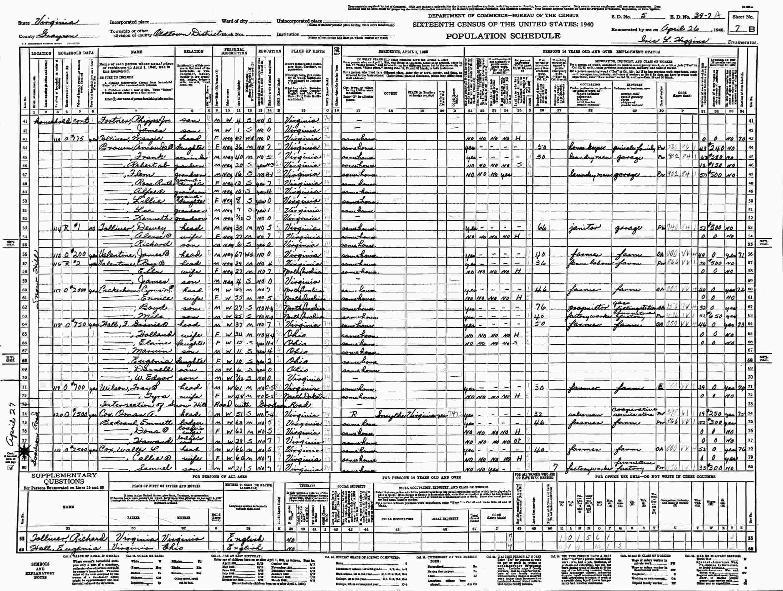April 26, 1930 - Supervisor's District 8, Enumeration District 39-7, Oldtown Magisterial District, Grayson County, Virginia.