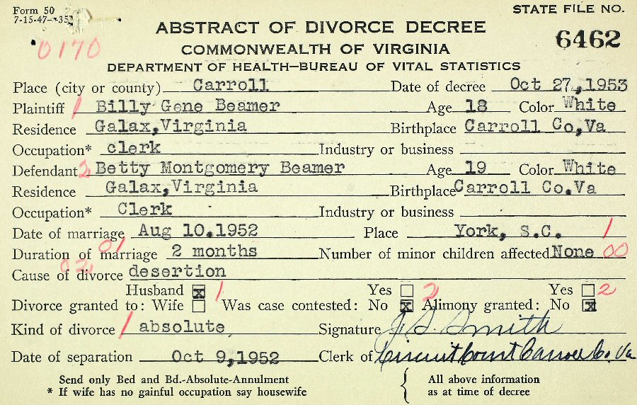 Married: Betty Montgomery August 10, 1952 in York County, South Carolina. (Divorce: October 9, 1952, Carroll County, Virginia.)