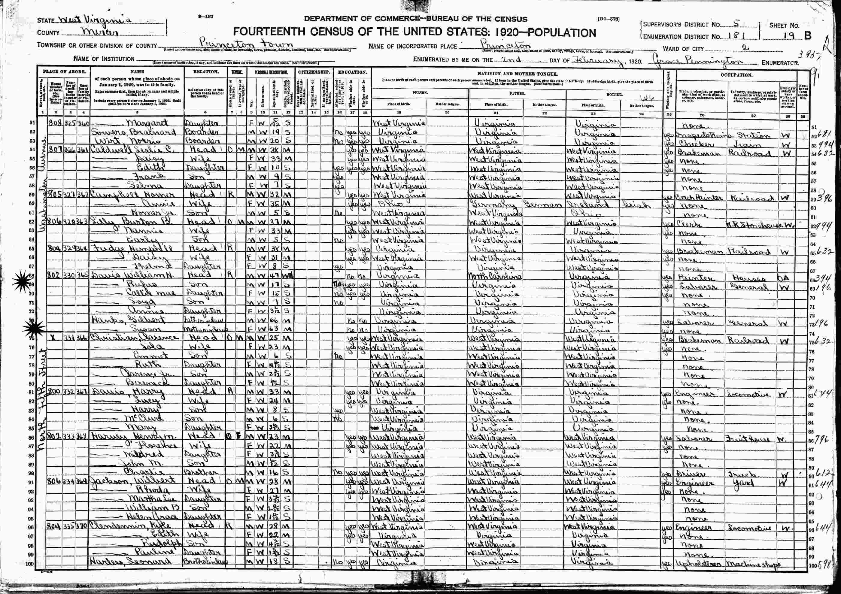 February 2, 1920 - 802 Washington Avenue, Princeton, Supervisor's District 5, Enumeration District 181, Mercer County, West Virginia.