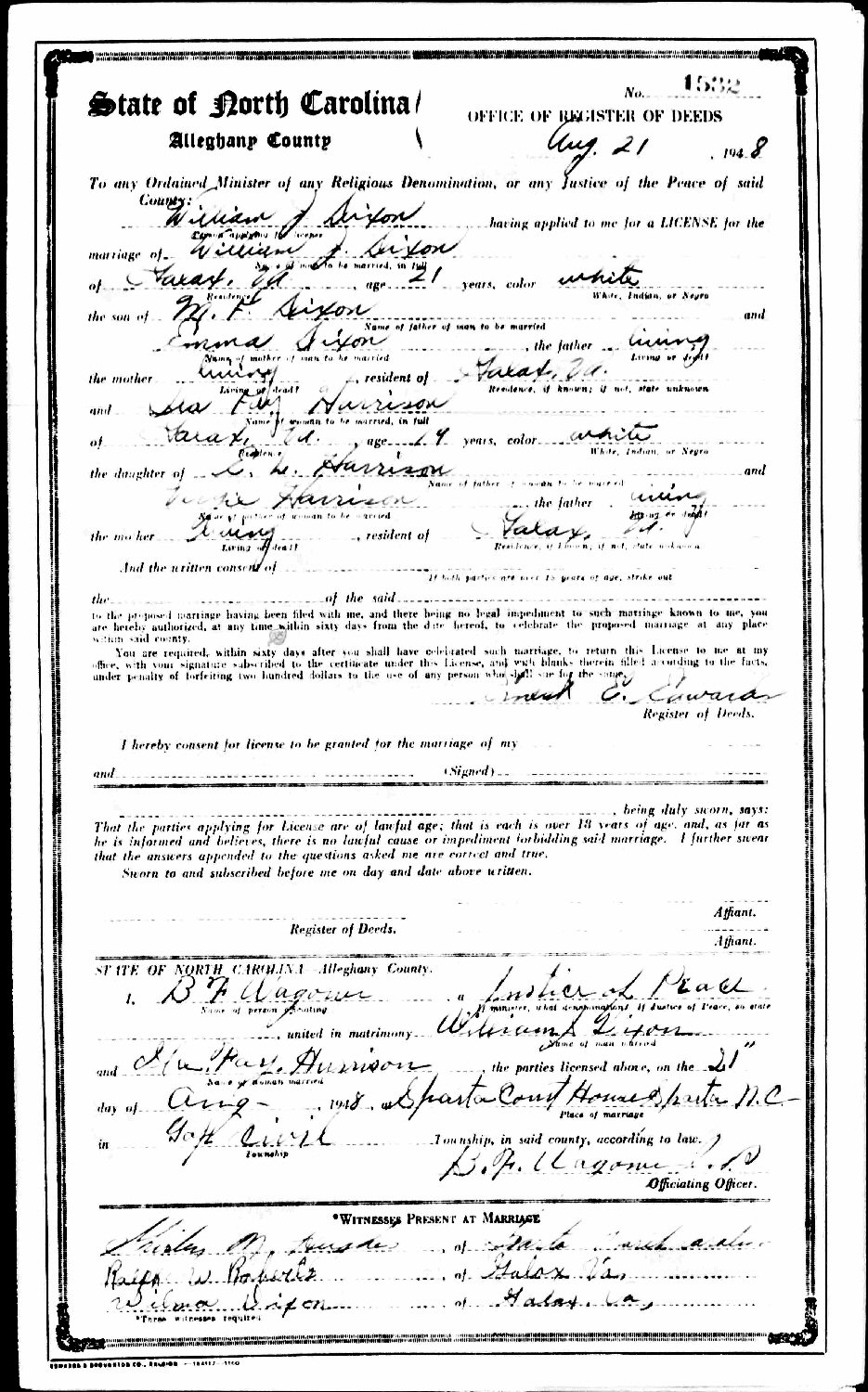 Married: Ila Faye Harrison August 21, 1948 in Alleghaney County, North Carolina.