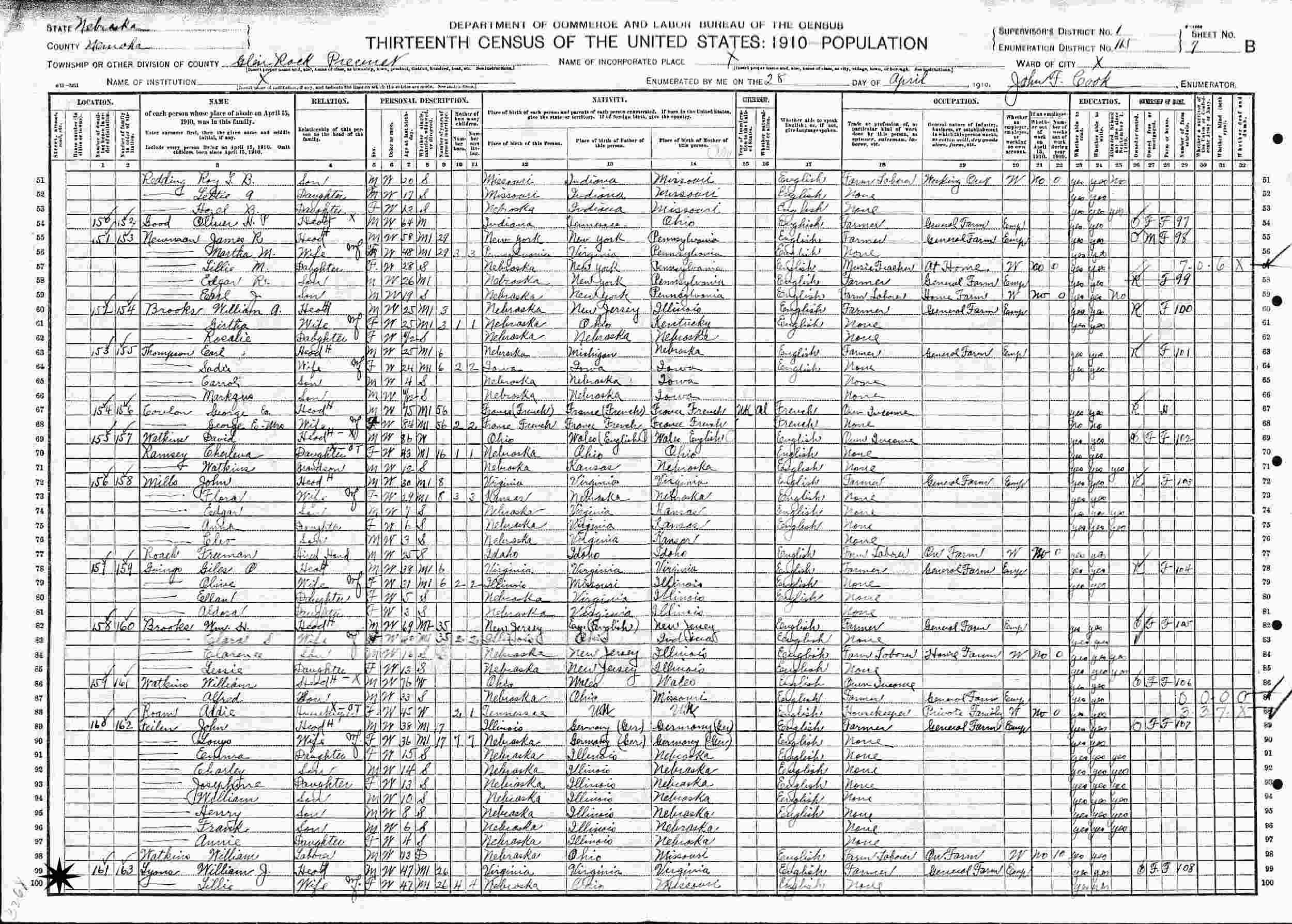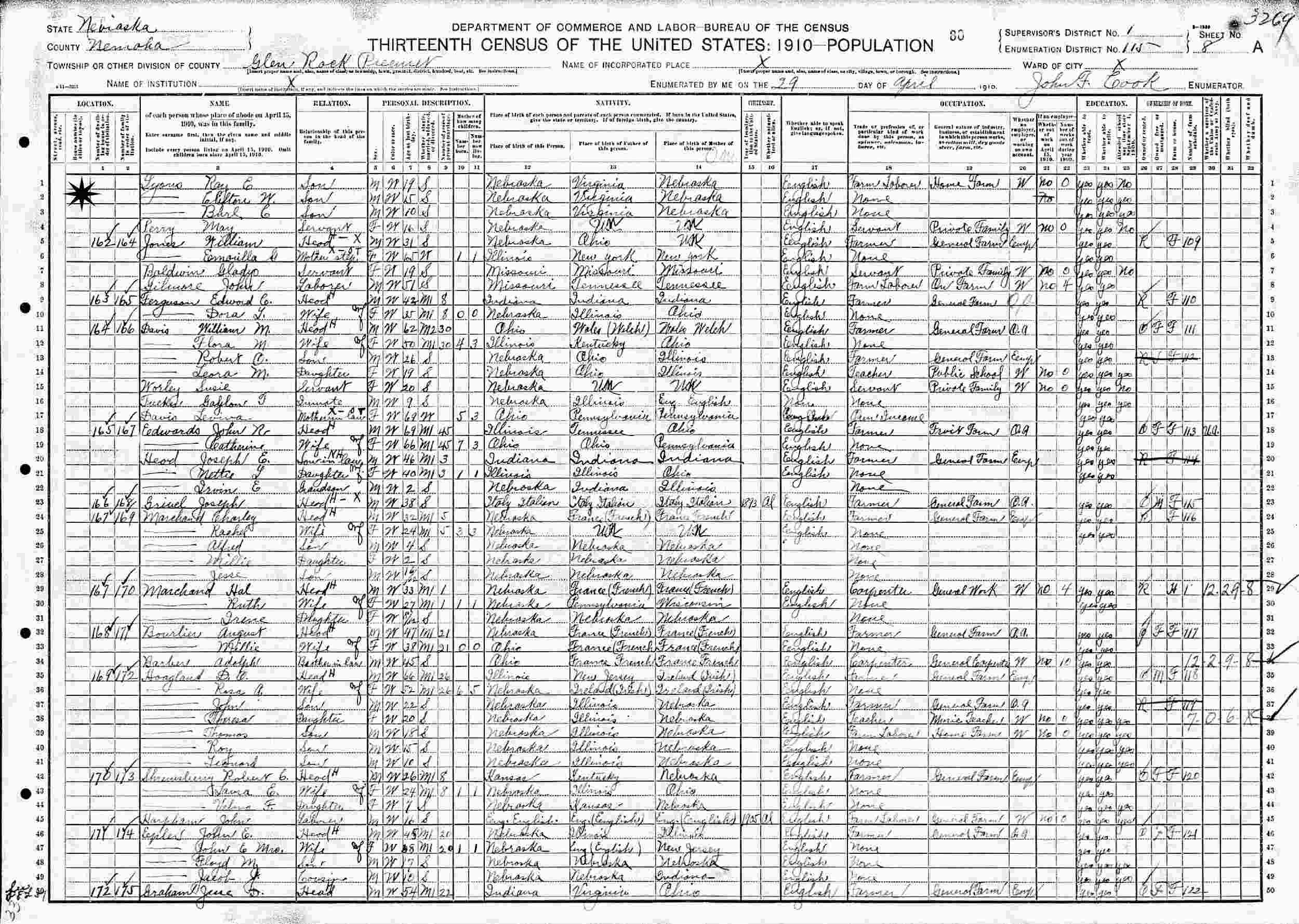 April 29, 1910 - Supervisor's District 1, Enumeration District 115, Glen Rock, Nemaha County, Nebraska.
