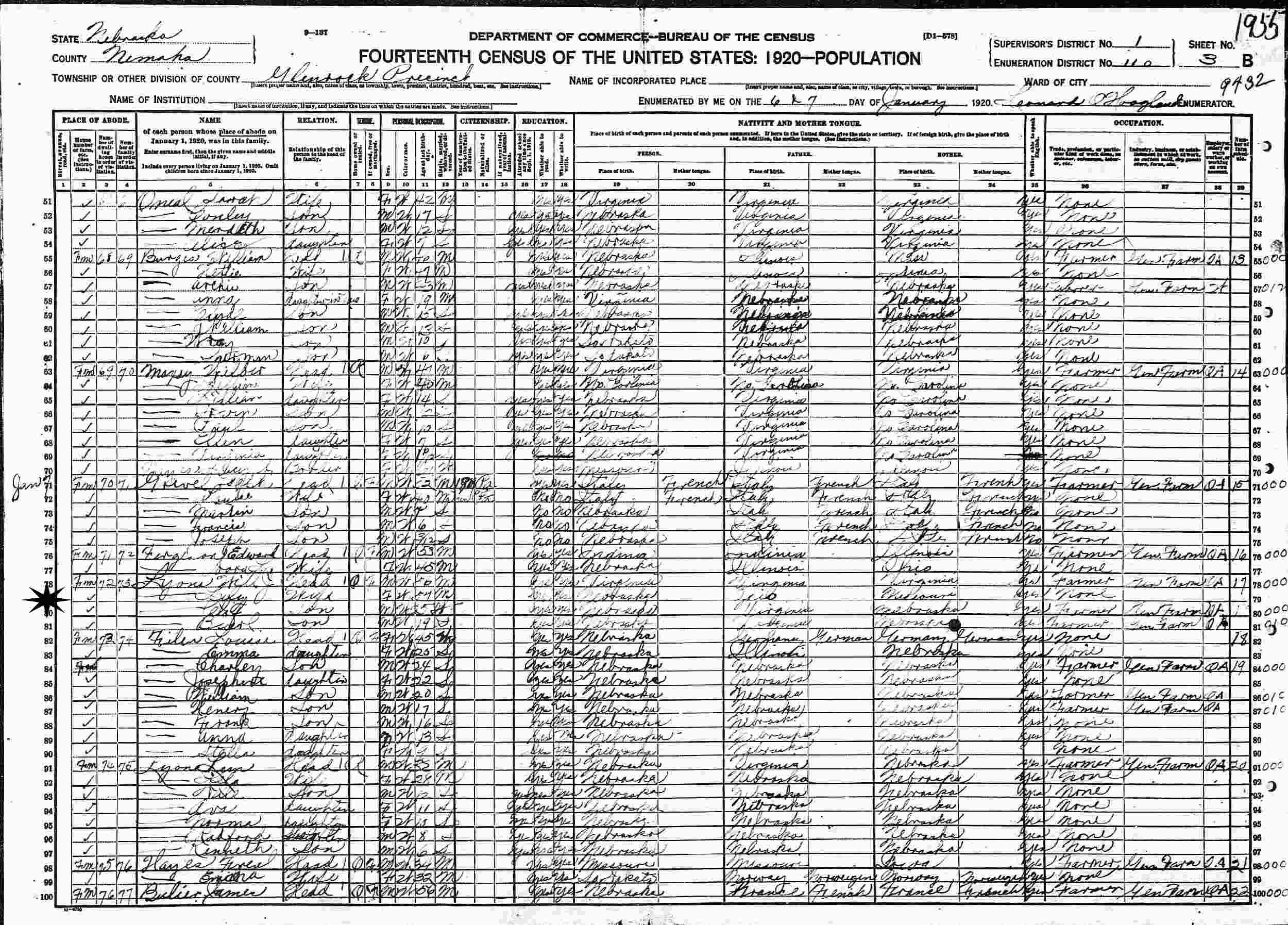 January 6-7, 1920 - Supervisor's District 1, Enumeration District 110, Glen Rock, Nemaha County, Nebraska.