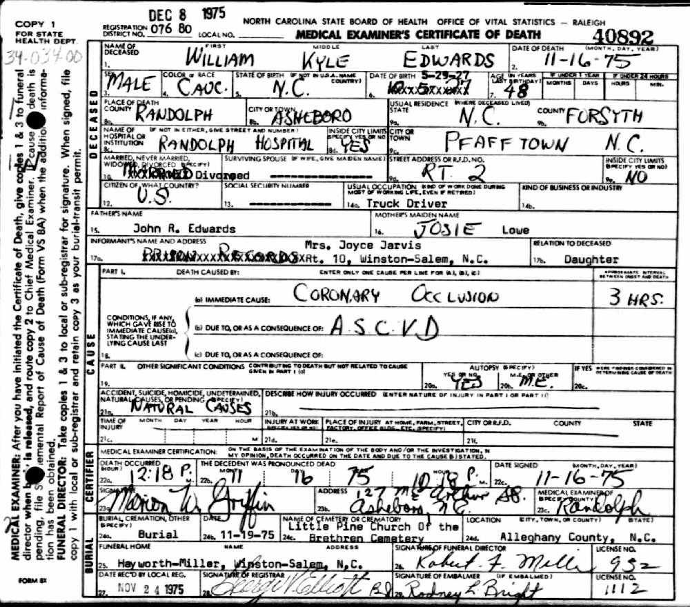 Died: November 16, 1975 in Randolph Hospital, Asheboro, Randolph County, North Carolina.
