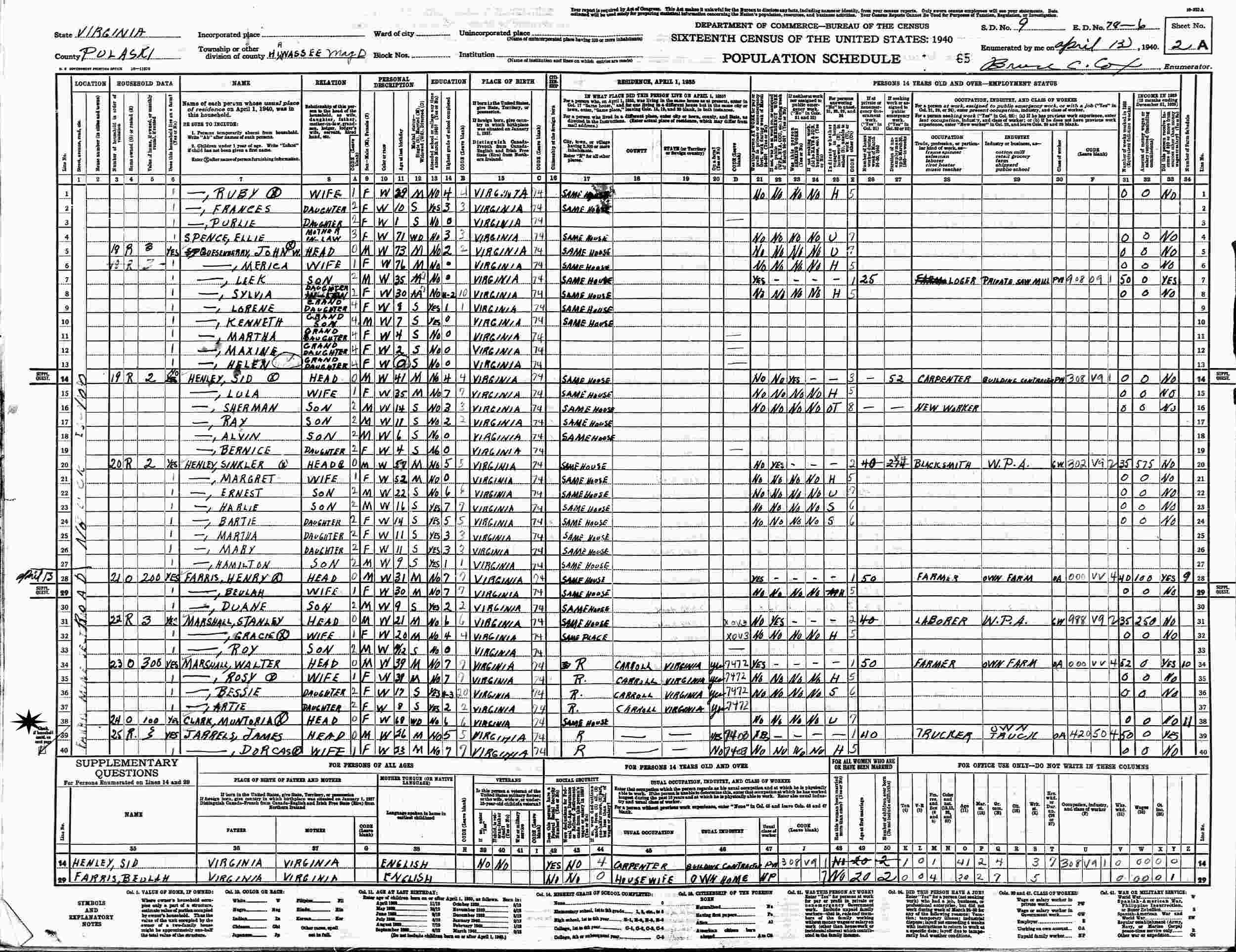 April 13, 1940 - Farris Mine Road, Supervisor's District 9, Enumeration District 78-6, Hiawassee Magisterial District, Pulaski County, Virginia.