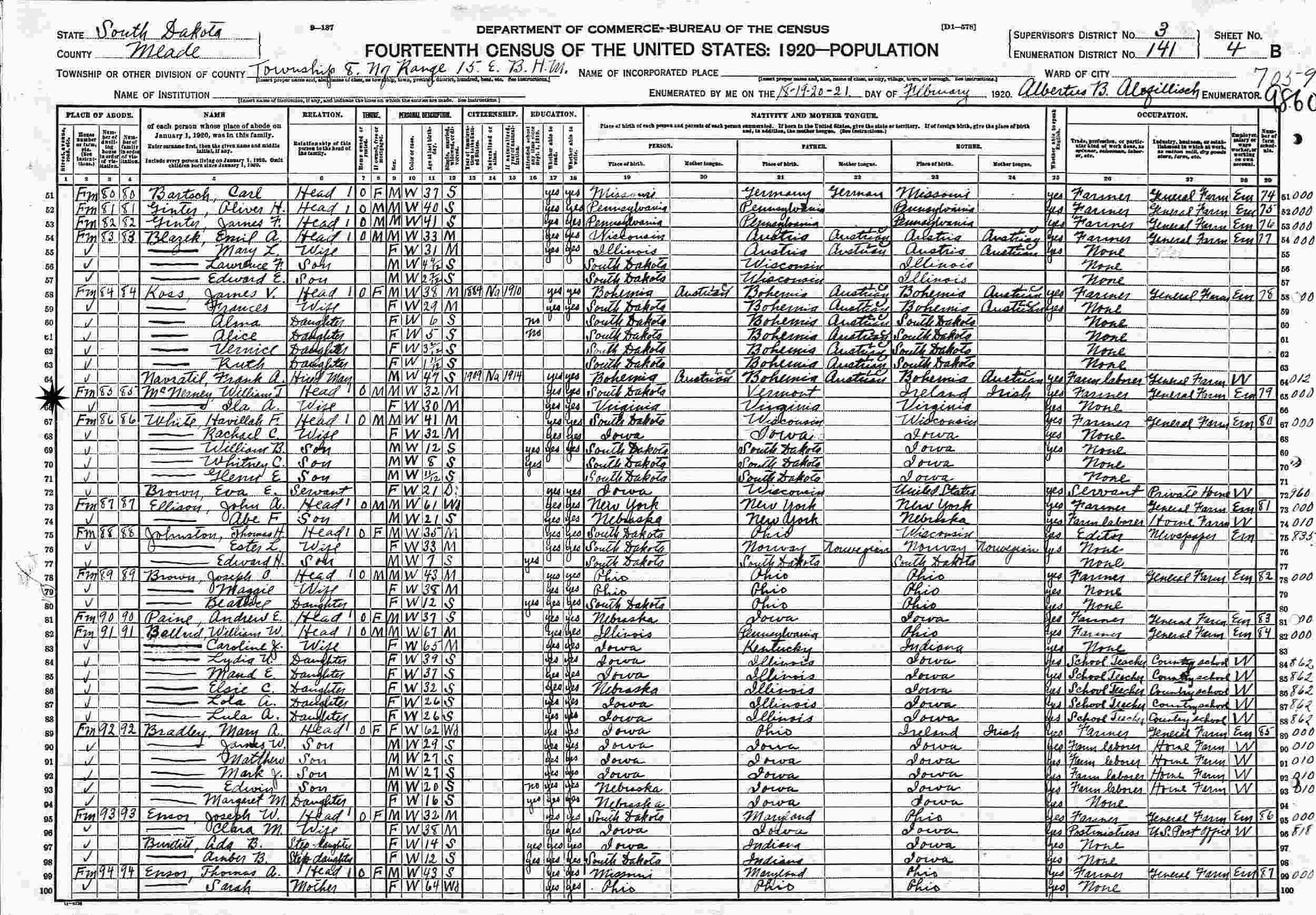 February 18-21, 1920 - Township 8 N of Range 15 E B.H.M. Supervisor's District 3, Enumeration District 131, Meade County, South Dakota