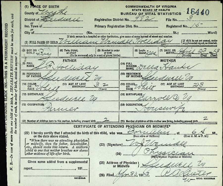 Notes for WILLIAM WENDELL HOLLIDAY:
