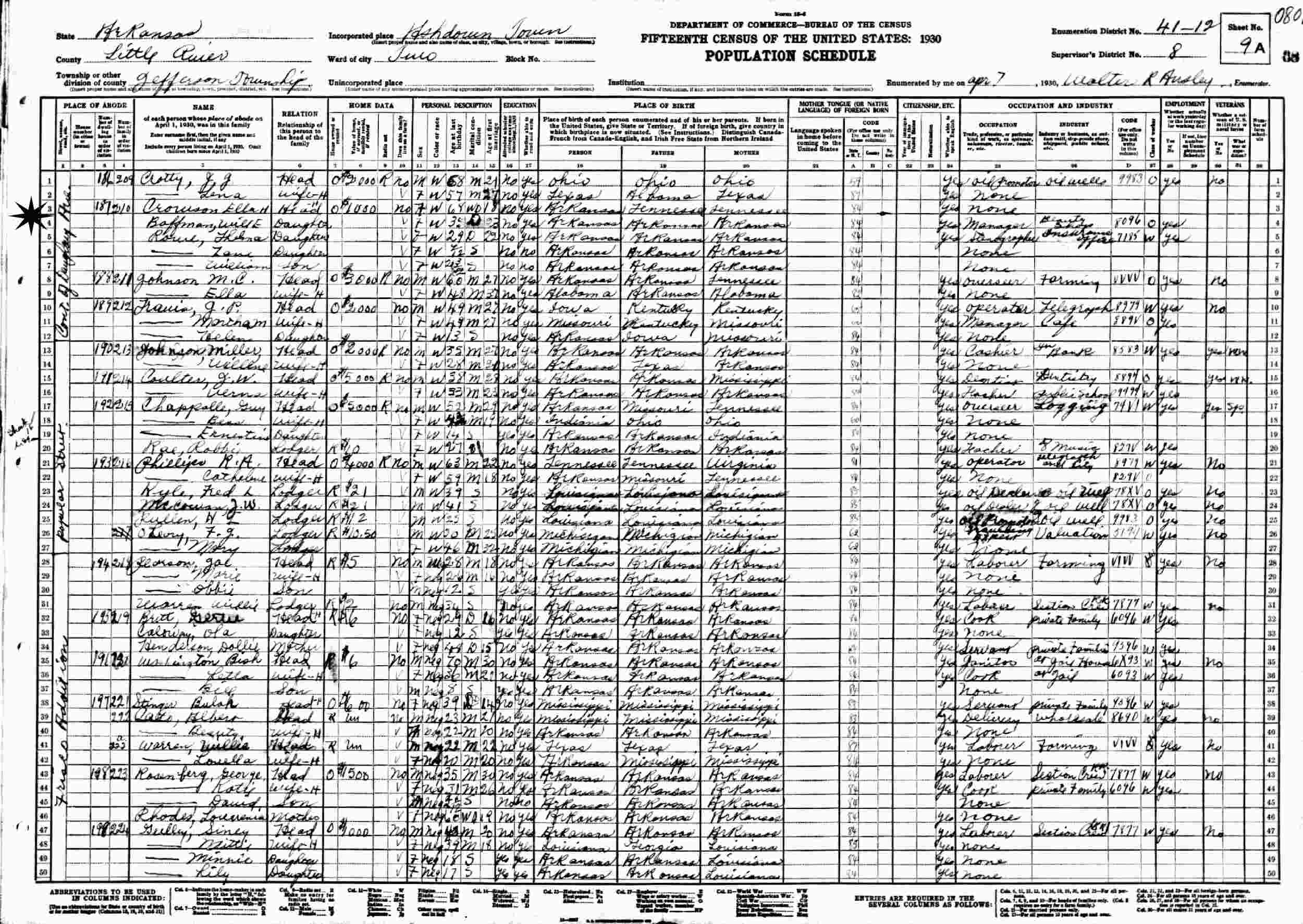 April 7, 1930 - Daughtery Avenue, Jefferson Township, Ashdown Town, Ward 2, Supervisor's District 8, Enumeration District 41-12, Little River County, Arkansas.