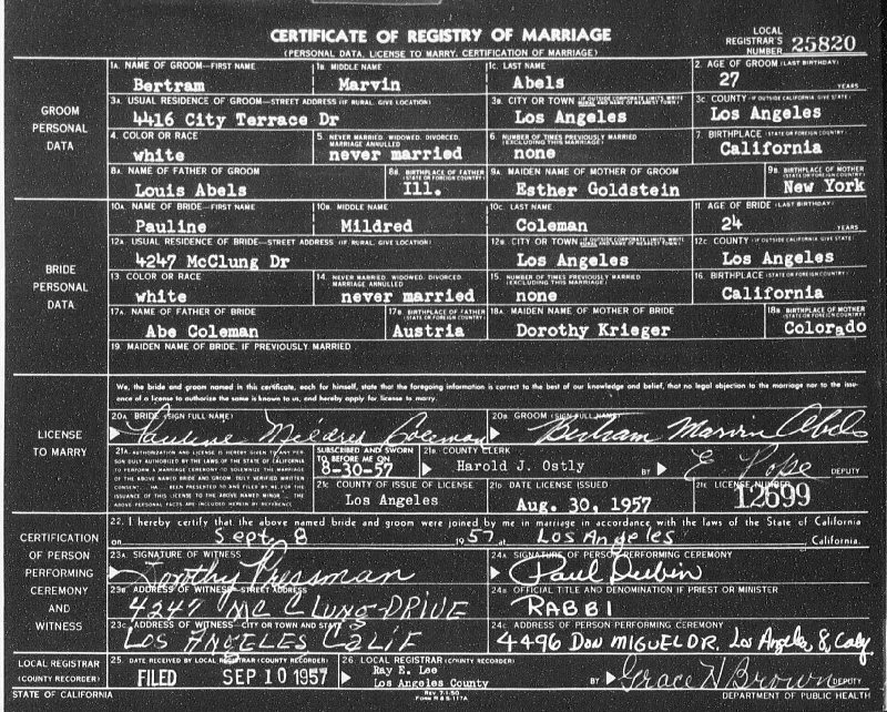 Married: Betram Marvin Abels September 8, 1957 in Los Angeles County, California.