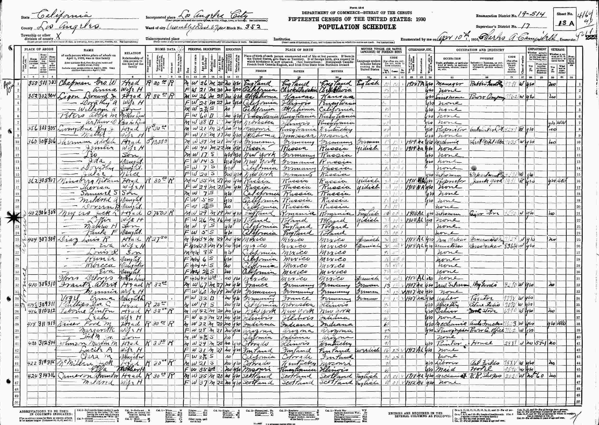 April 10, 1930 - 402 Florence Avenue, Assembly District 67, Block 352, Supervisor's District 17, Enumeration 19-514, Los Angeles, Los Angeles County, California.