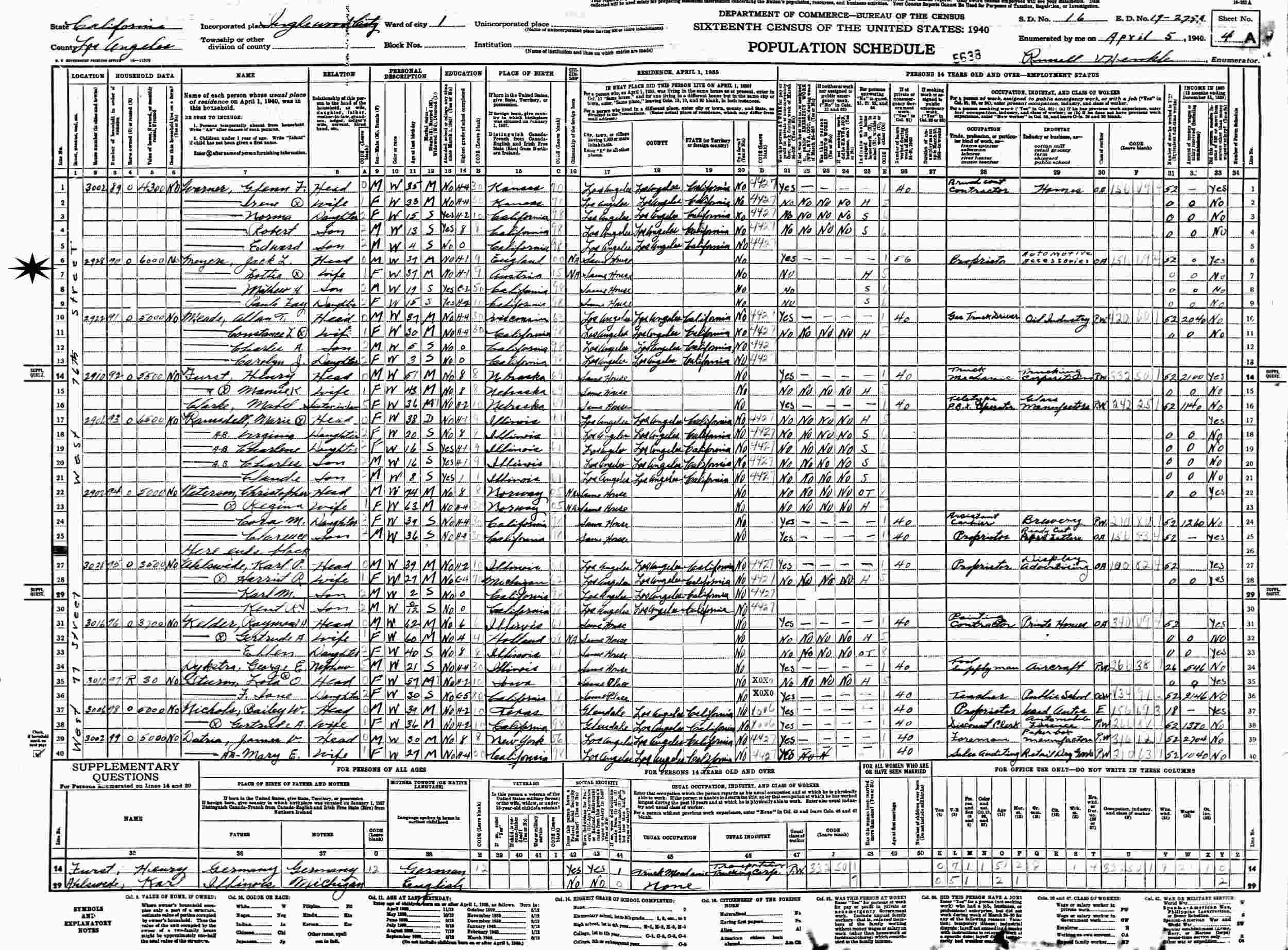 April 5, 1940 - 2928 West 76th Street, Ward 1, Supervisor's District 16, Enumeration District 19-279A, Inglewood, Los Angeles County, California.