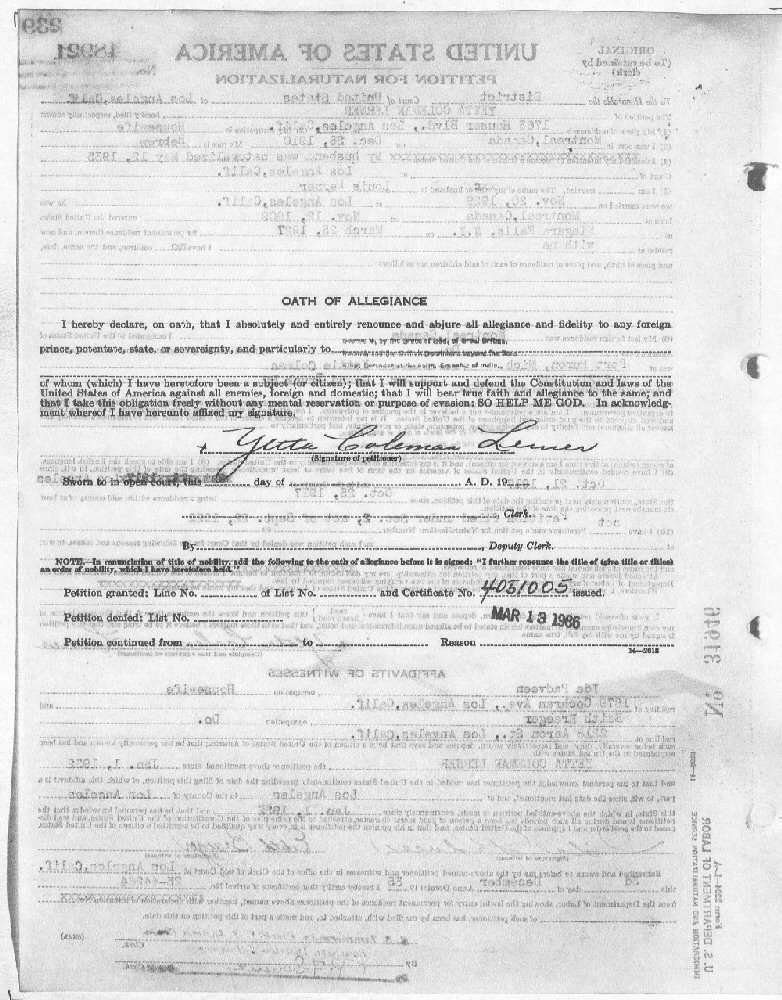 Naturalization: Certificate #4051005 March 13, 1966 - Los Angeles, Los Angeles County, California.