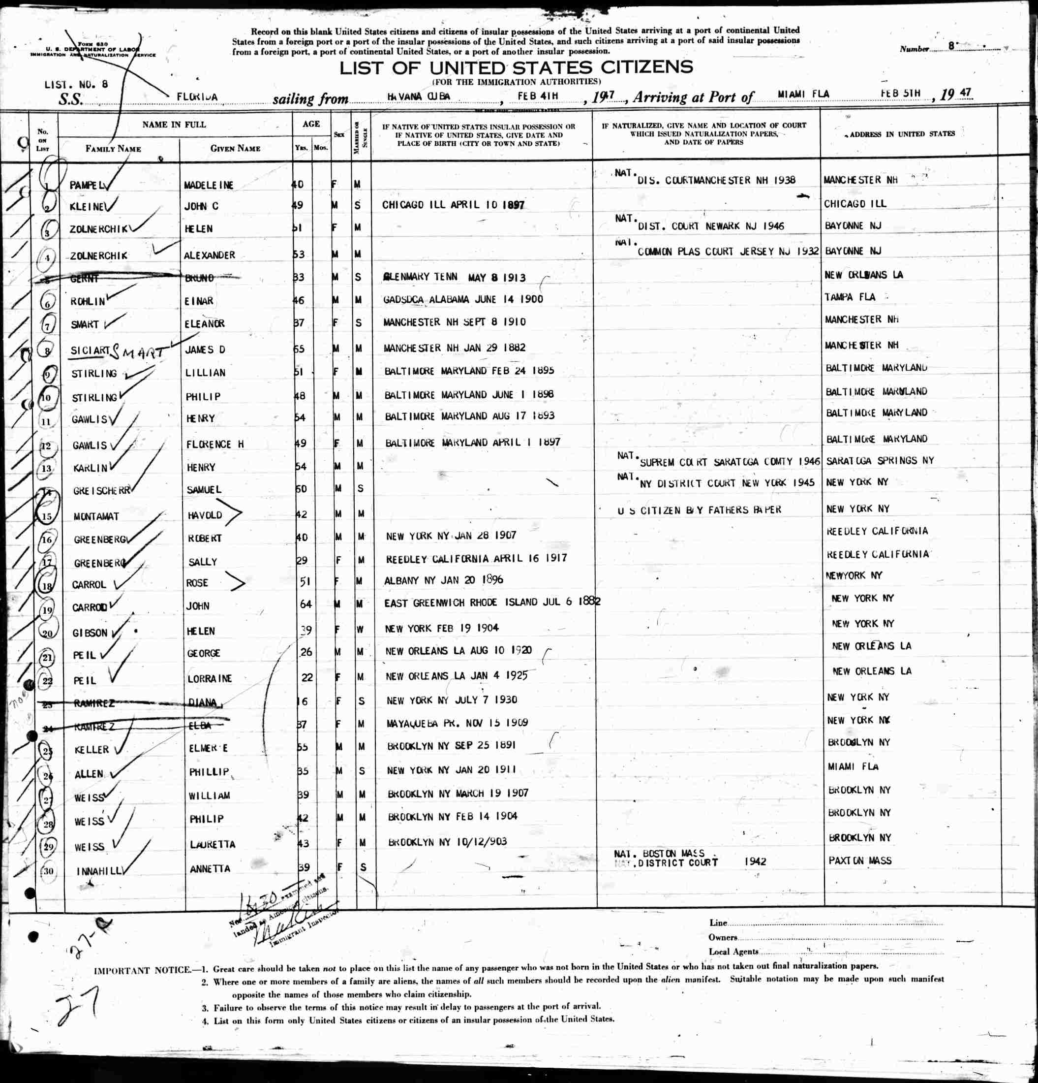 February 4-5, 1947 - Havana, Cuba to Miami, Florida; Ship: S.S. Florida.