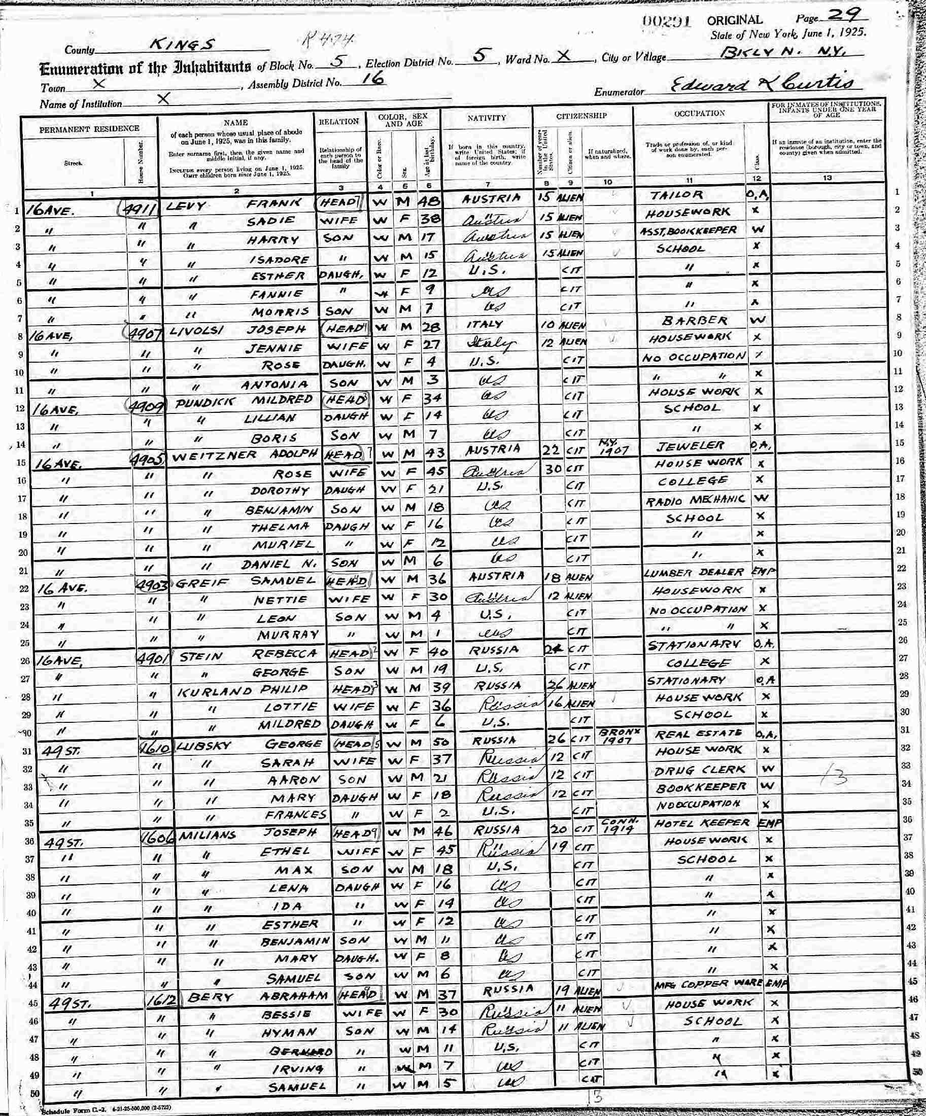 June 1, 1925 - New York Census - 1612 49th Street, Block 5, Aseembly District 16, Election Ward 5, Brooklyn, Kings County, New York.