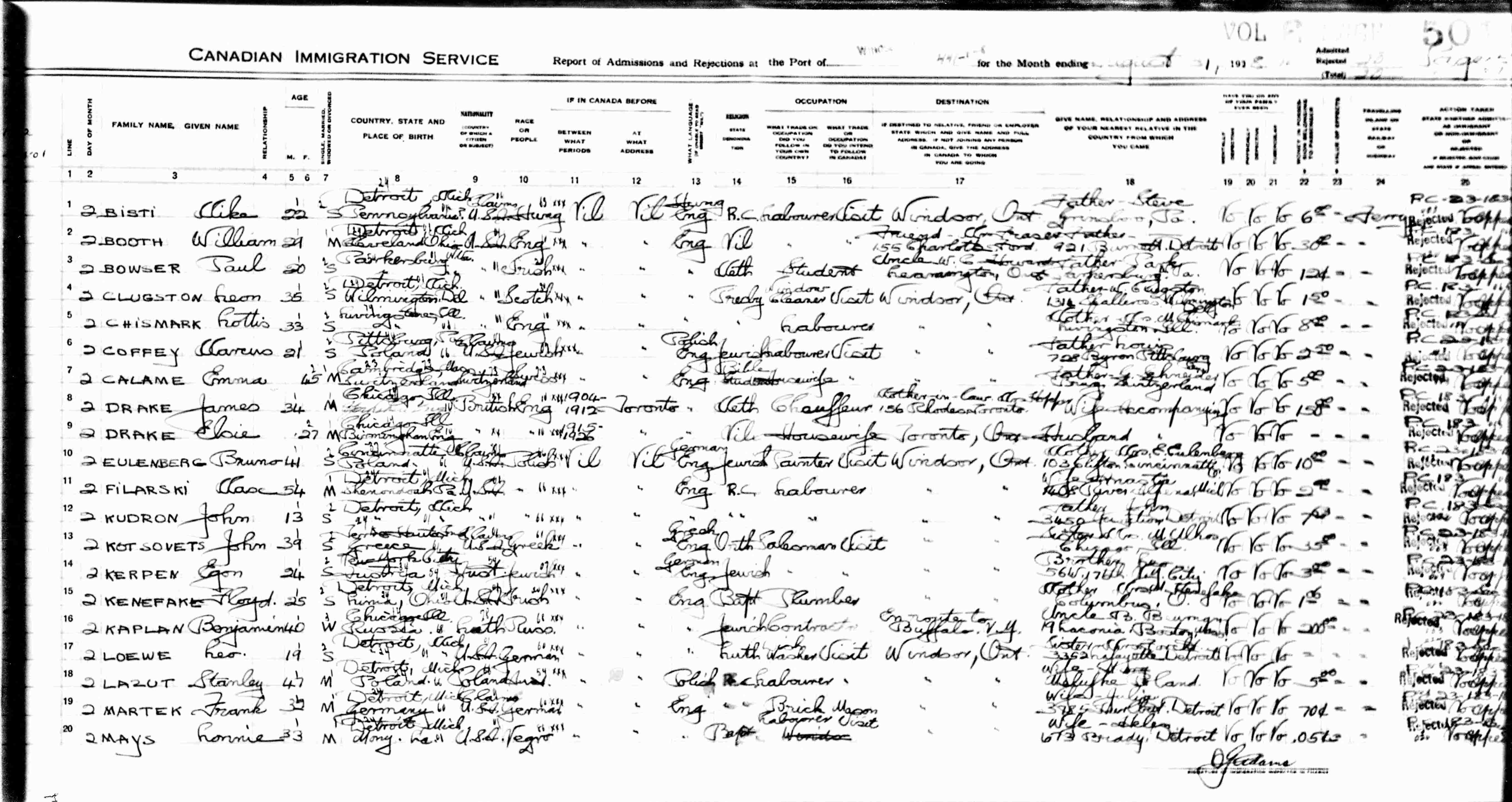 Crossing U.S. to Windsor, Ontario, Canada: August 2, 1928.