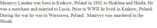 Notes for MOURYCY "MORITZ" LANDAU: Son of Szacha and Hinda (Margulies) Landau. Born: 1892 in Krakow, Poland. Died: Unknown in Shoah. Married: Lucia Monke Unknown in Unknown.