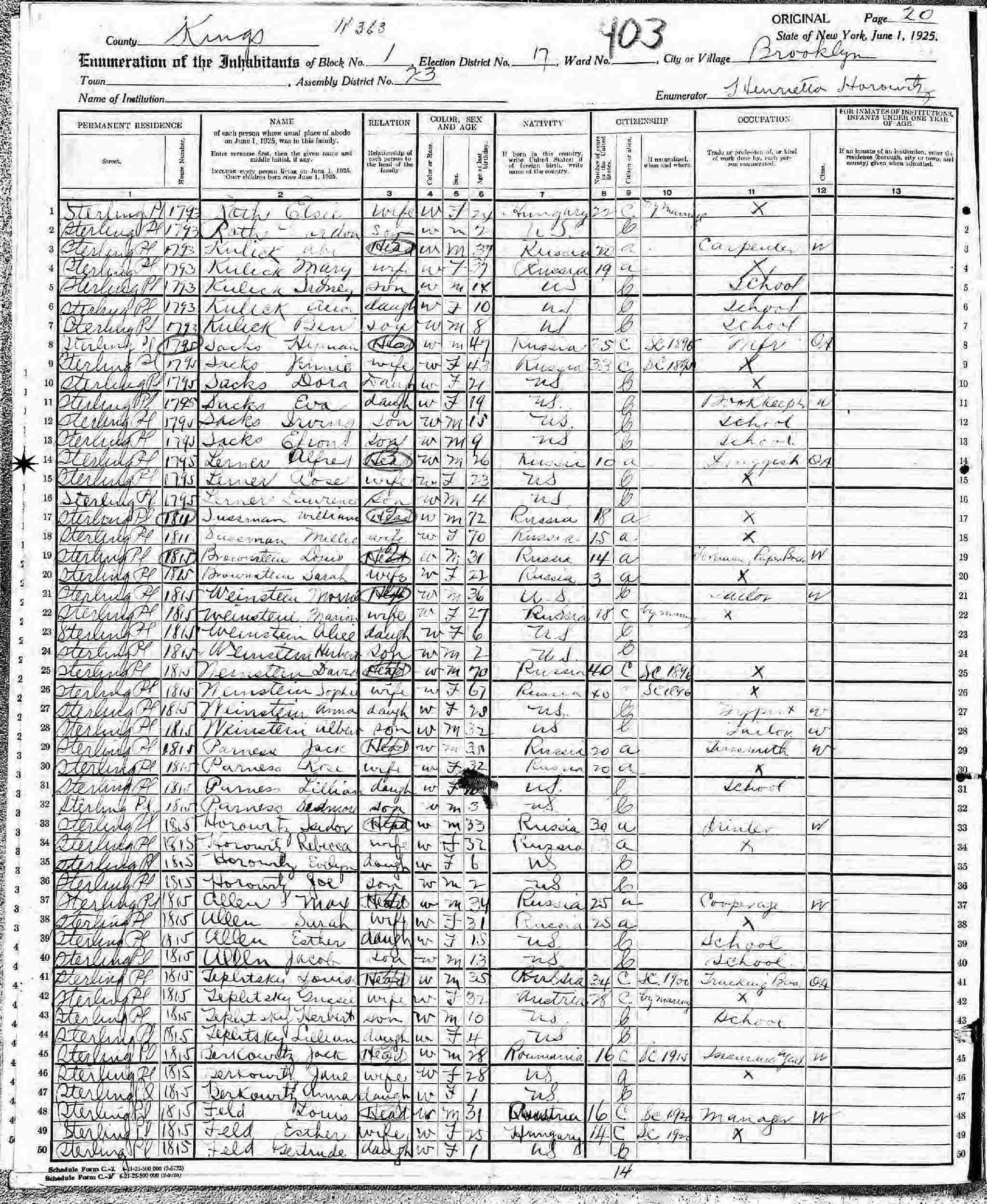 June 1, 1925 - New York State - 1795 Sterling Place, Block 1, Election District 17, Assembly District 23, Brooklyn, Kings County, New York.