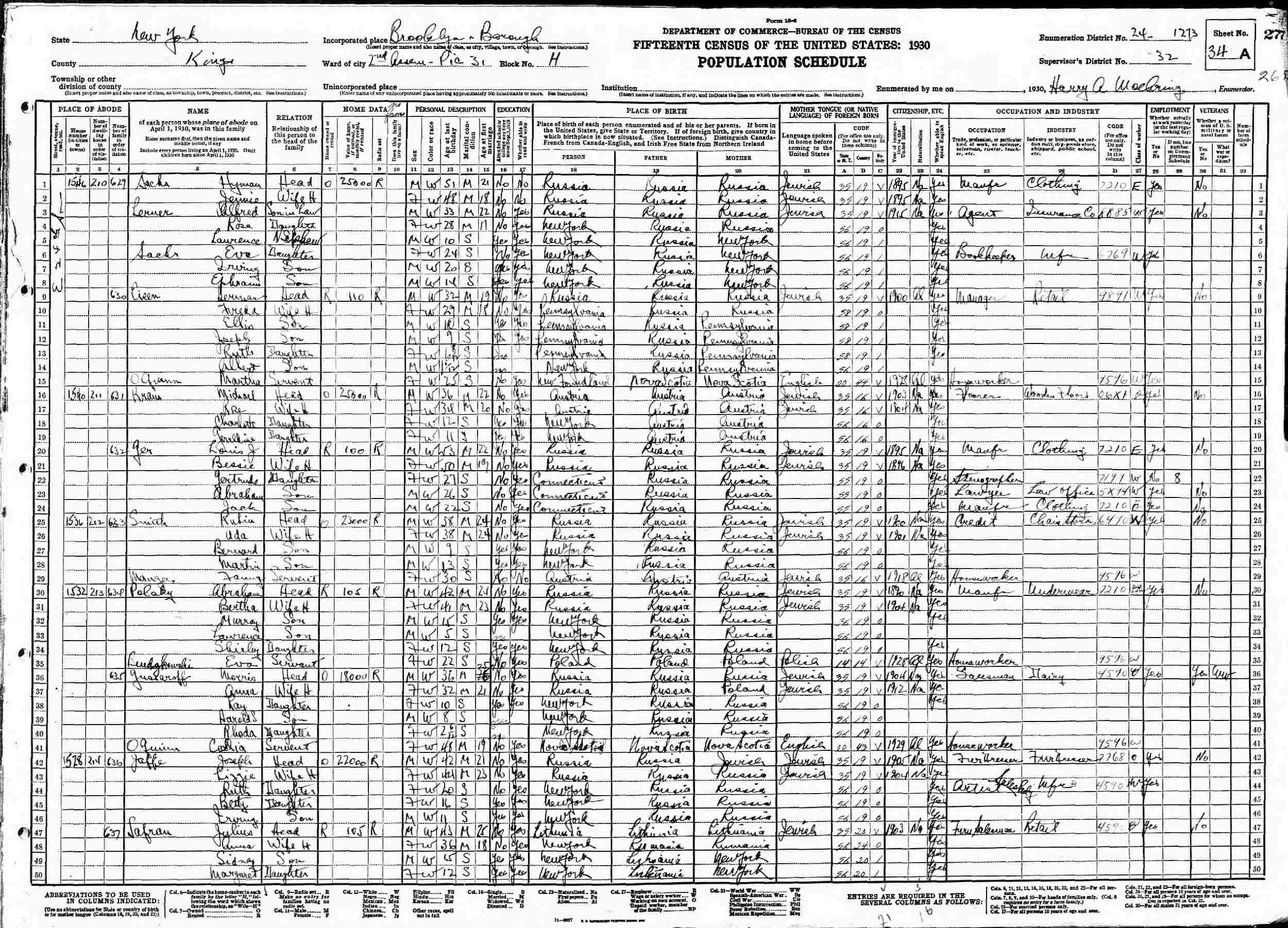 1930 - 1546 E 24th Street, Assembly District 2, Precinct 31, Block H, Supervisor's District 32, Enumeration District 24-1273, Brooklyn, Kings County, New York.