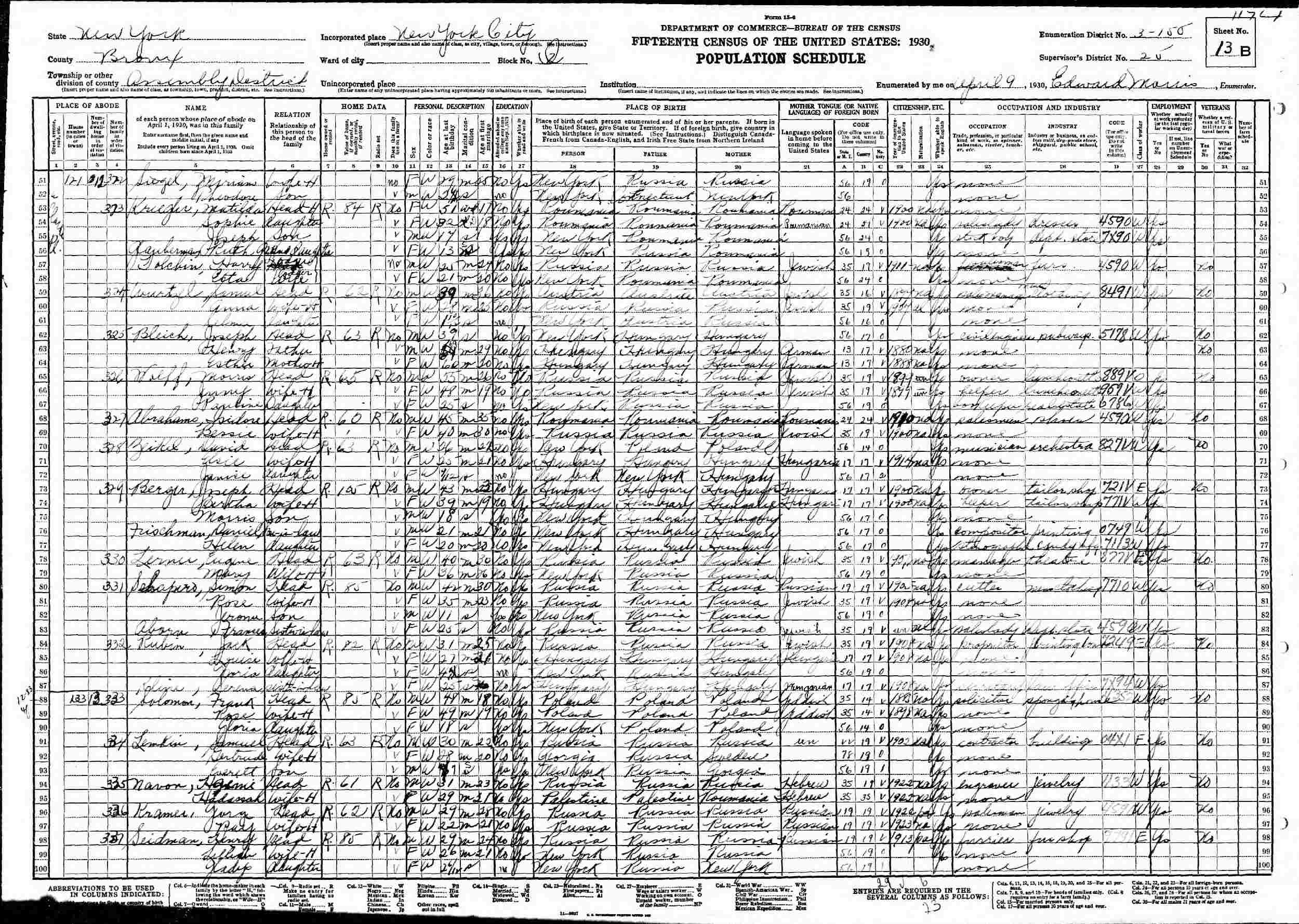 April 9, 1930 - 121 E Clarke Place, Block I, Supervisor's District 25, Enumeration District 3-155, Bronx, New York.