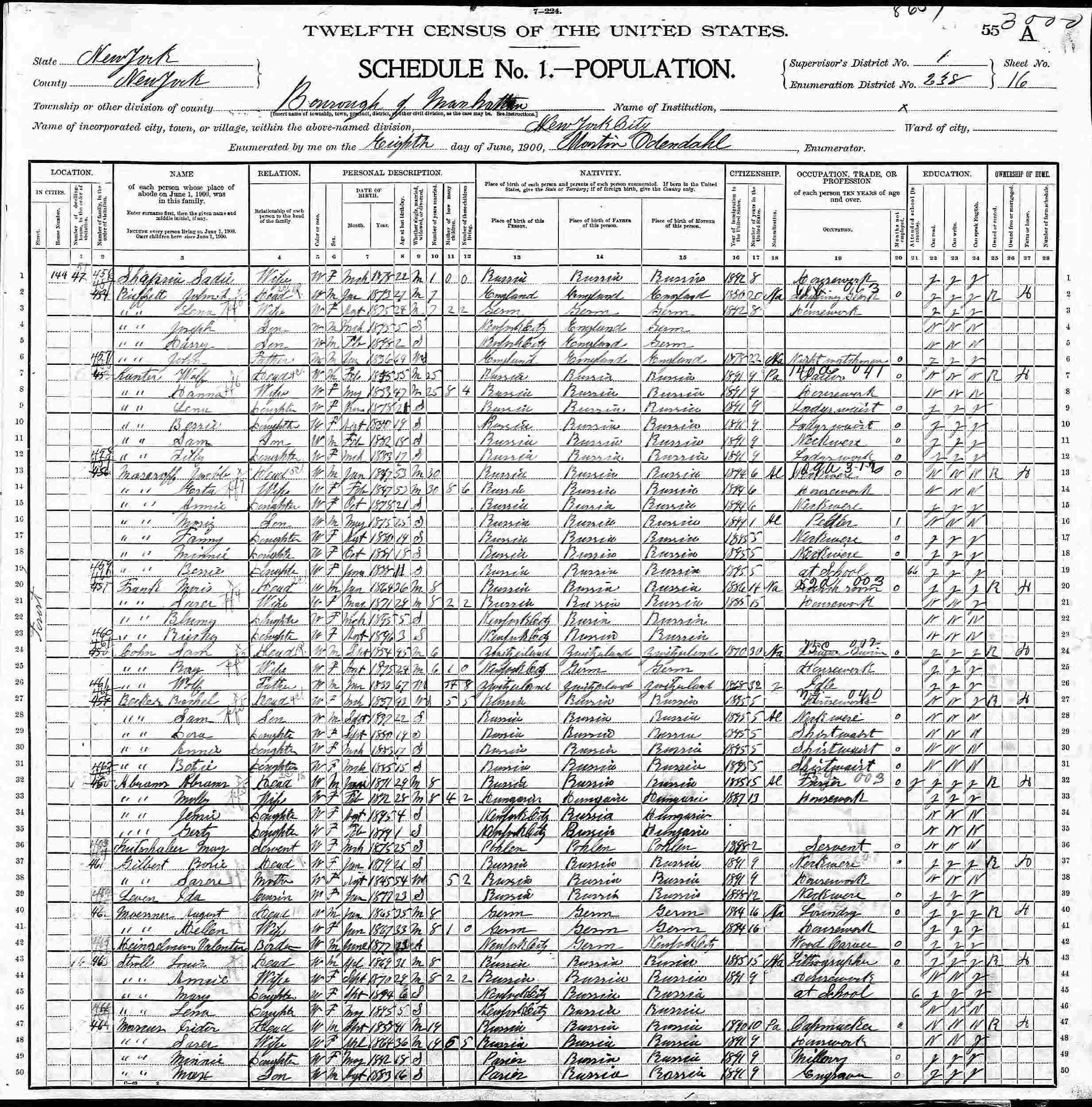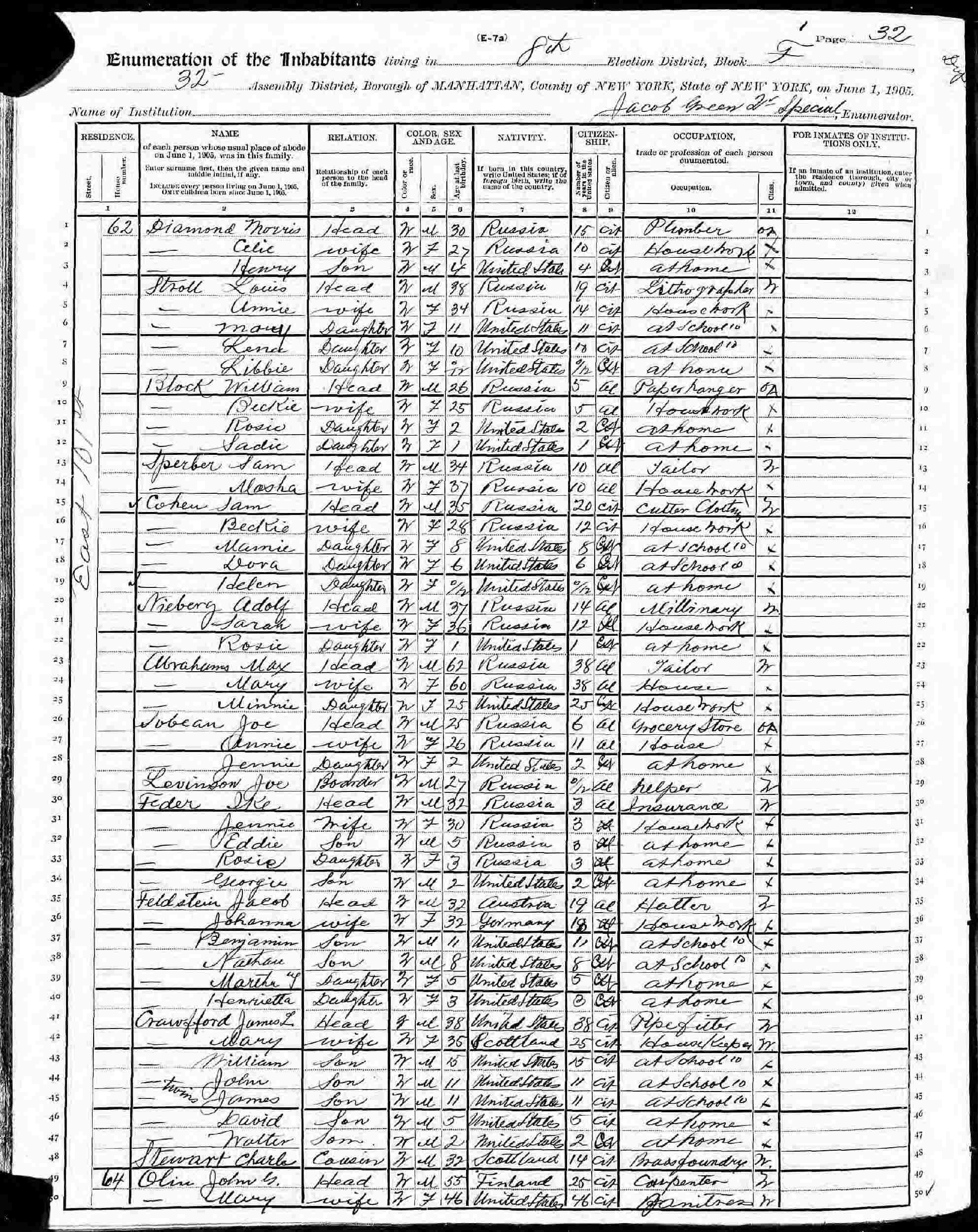 June 1, 1905 - New York State - 62 101 E 101 Street, Assembly District 32, Election District 8, Block F, Manhattan, New York.