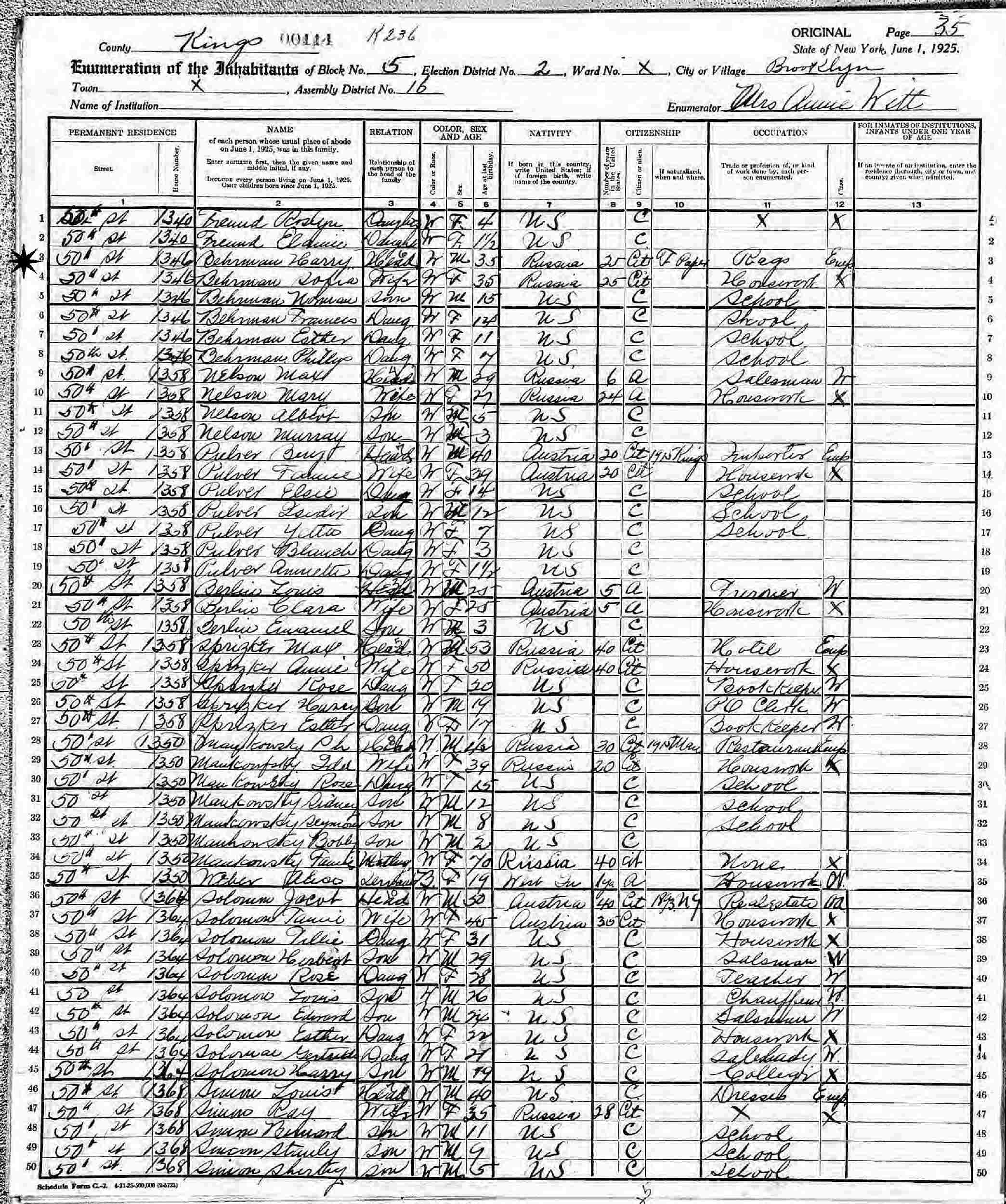 June 1, 1925 - New York State - 1346 50th Street, Block 5, Election District 2, Assembly District 16, Brooklyn, Kings County, New York.