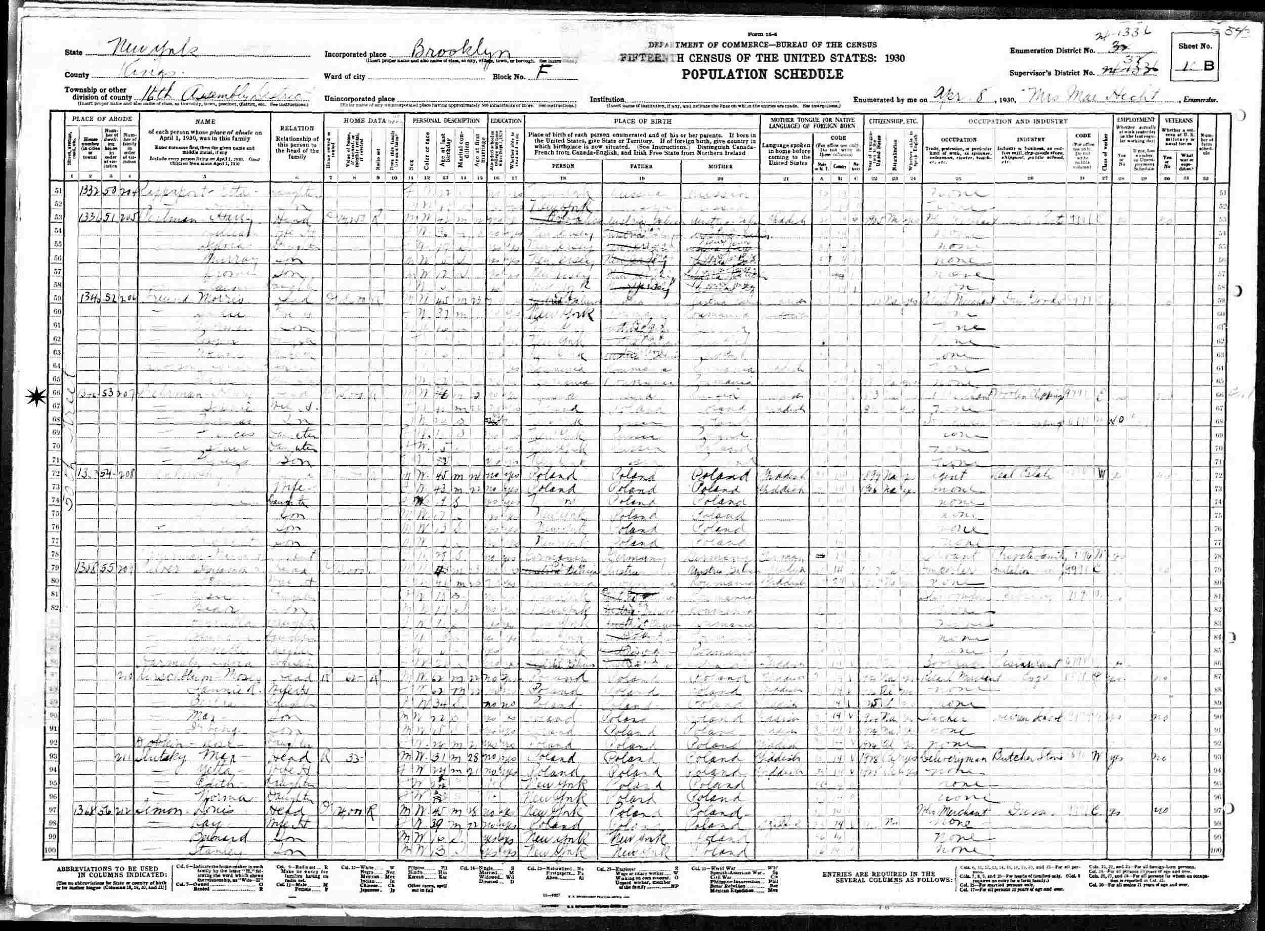 April 8, 1930 - 1346 50th Street, Assembly District 16, Block F, Supervisor's District 32, Enumeration District 24-1336, Brooklyn, Kings County, New York.