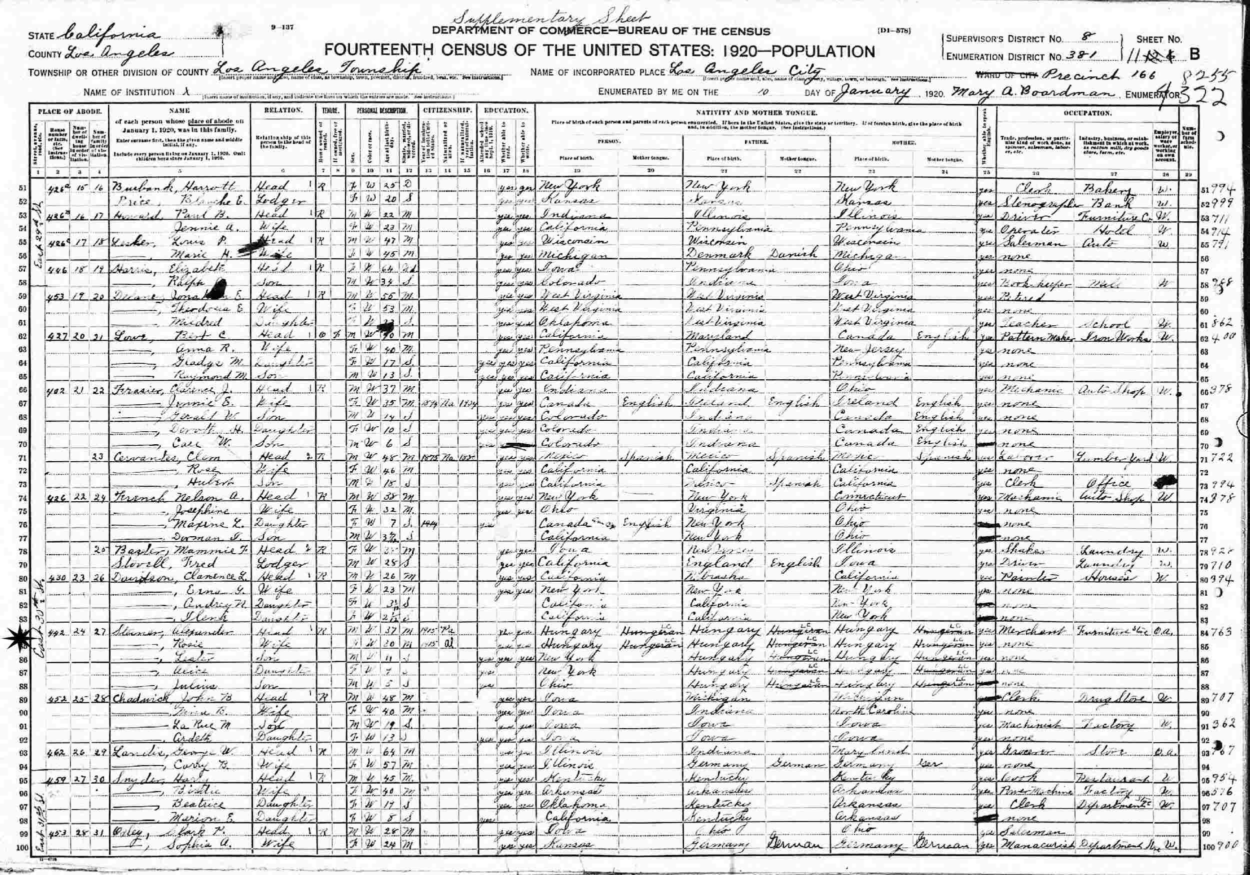 January 10, 1920 - 442 East 30th Street, Precint 166, Supervisor's District 8, Enumeration District 381, Los Angeles, Los Angeles County, California.