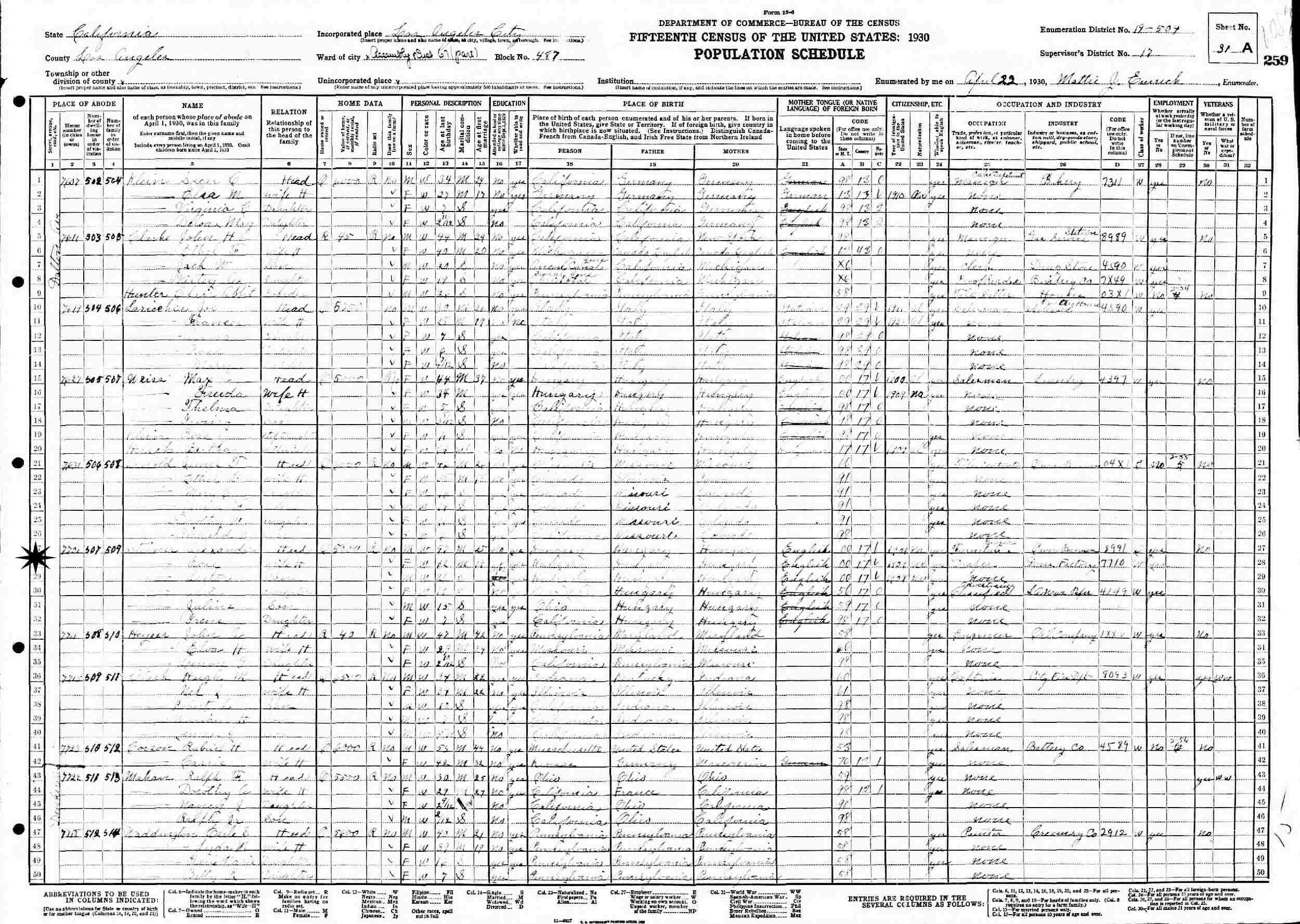April 22, 1930 - 7701 Dalton Avenue, Assembly Distric 67, Block 487, Supervisor's District 17, Enumeration District 19-504, Los Angeles, Los Angeles County, California.