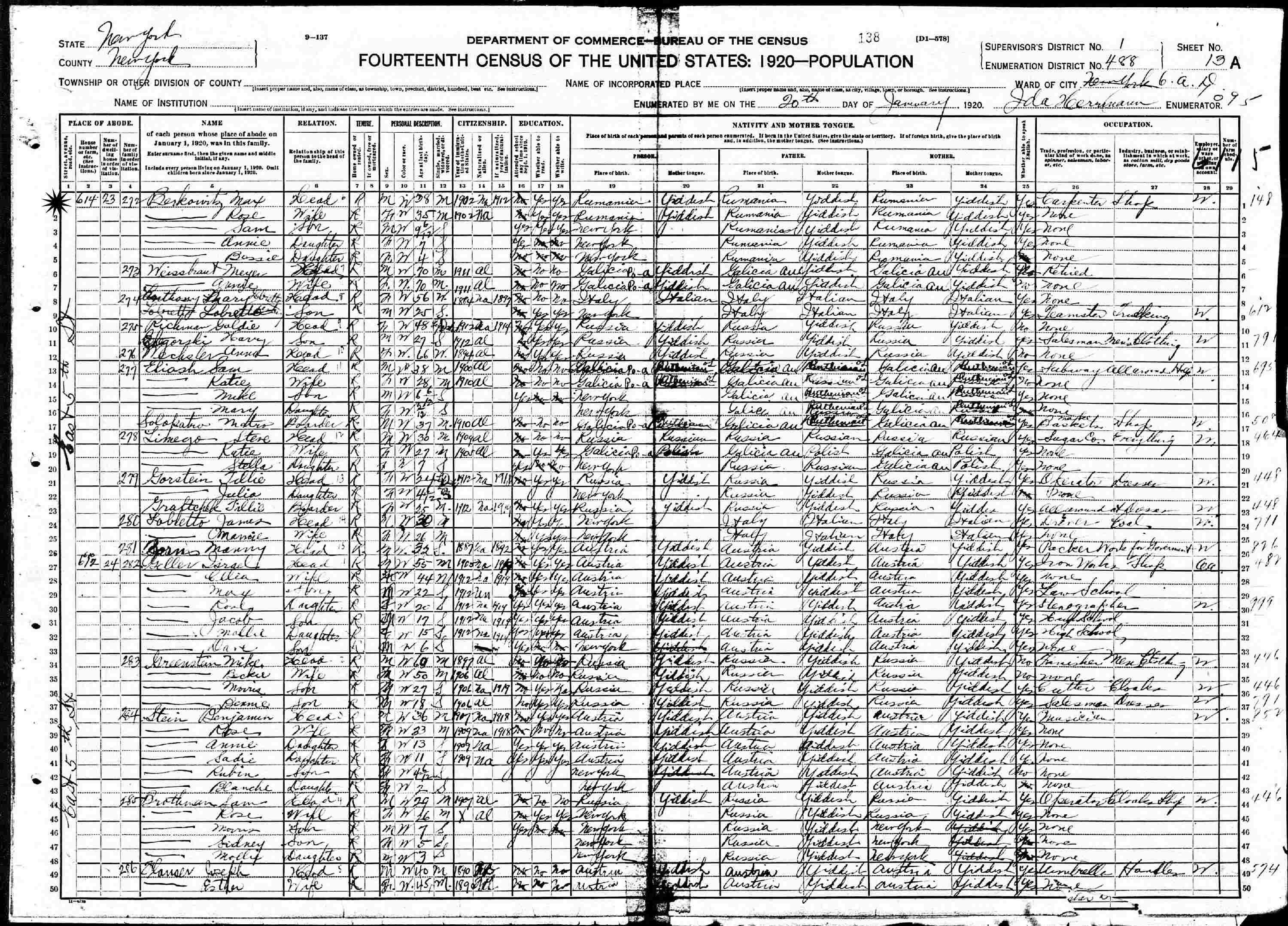 January 20, 1920 - 614 East 5th Street, Supervisor's District 1, Enumertion District 488, Assembly District 6, New York, New York.