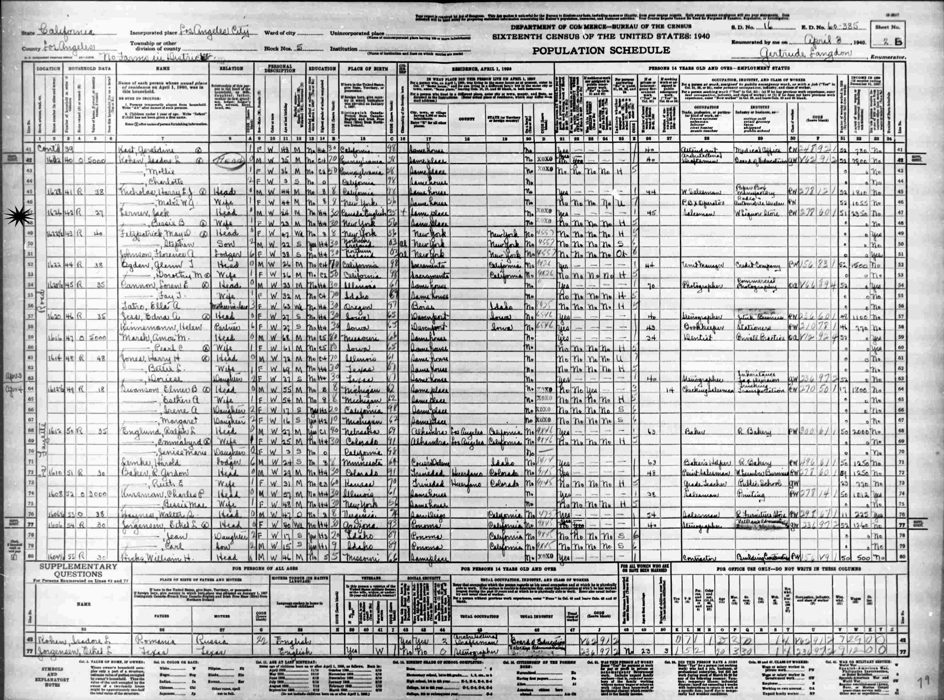 April 3, 1940 - 1626 La Fayette Road, Enumeration District (ED) 60-385, Assembly District 61, Councilmanic District 5, Los Angeles, Los Angeles County, California.