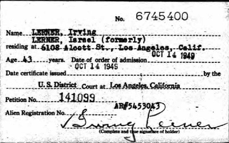 Naturalization: October 14, 1949 - Los Angeles, Los Angeles County, California.
