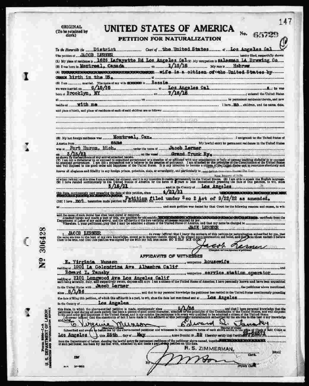 Petition for Naturalization: May 29, 1939 - Certificate #65729.
