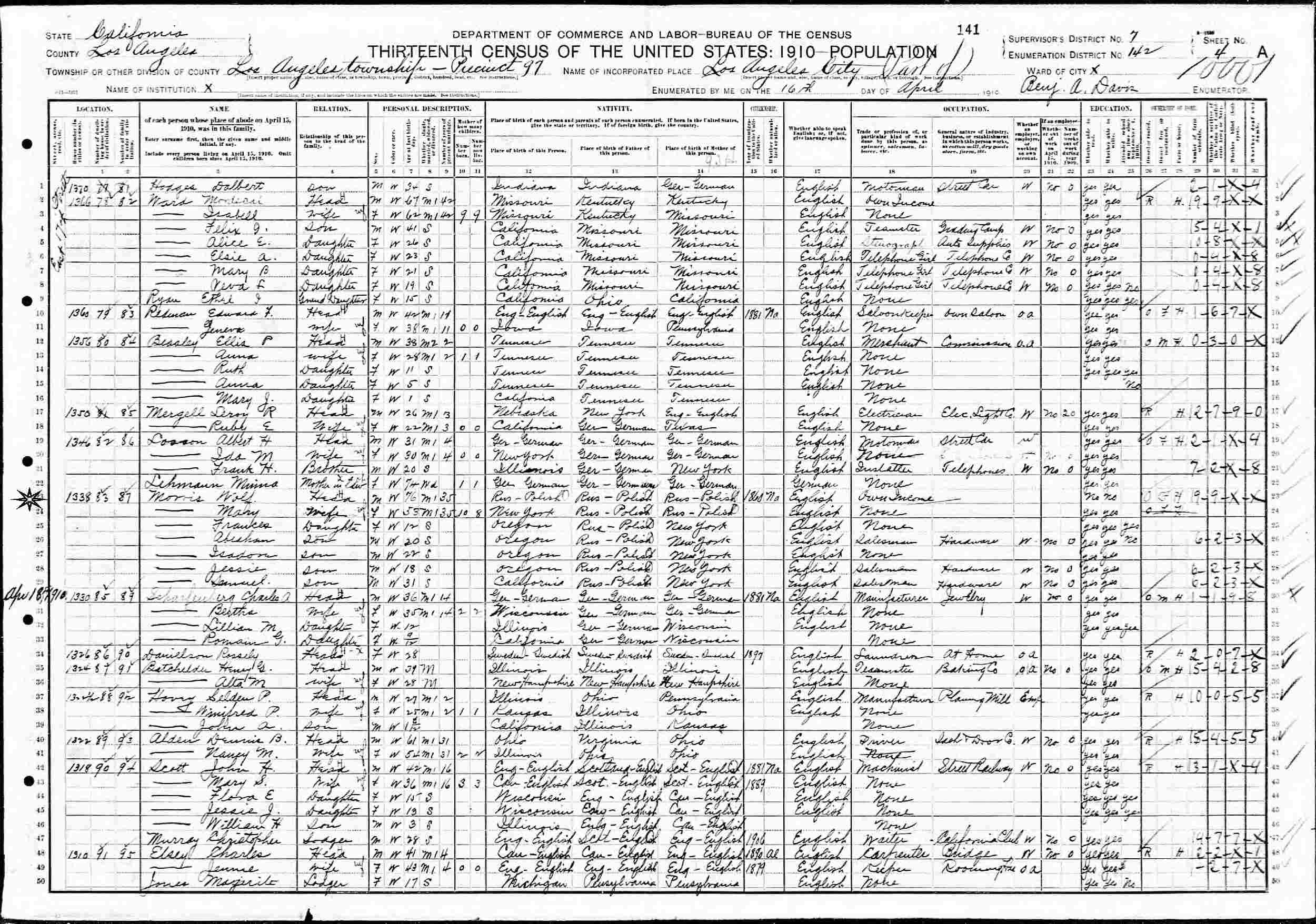 April 16, 1910 - 1338 East 17th Street, Precinct 97, Supervisor's District 7, Enumeration District 142, Los Angeles, Los Angeles County, California.