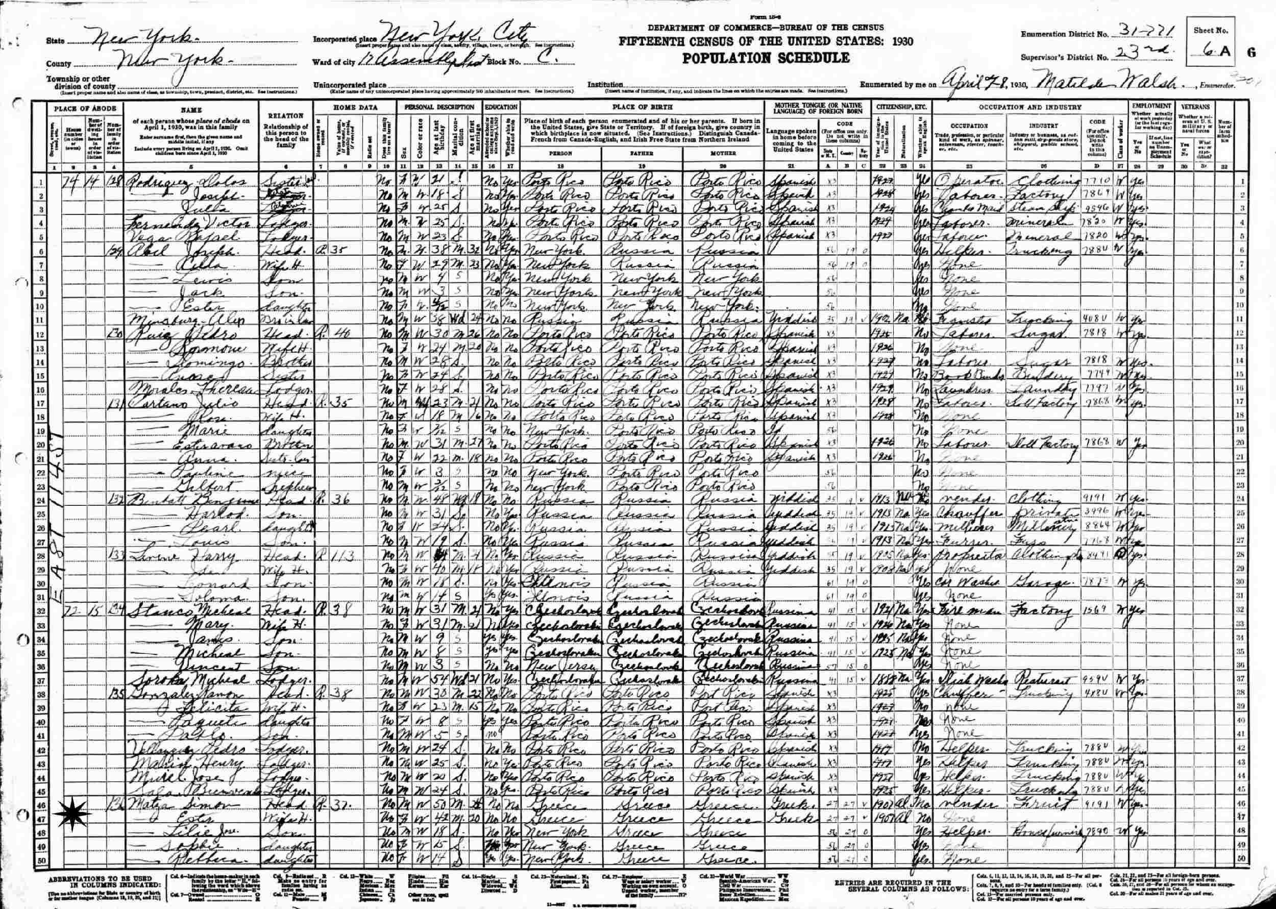 April 7-8, 1930 - 72 East 114th Street, Block C, Assembly District 17, Supervisor's District 23, Enumeration District 31-771, New York City, New York.