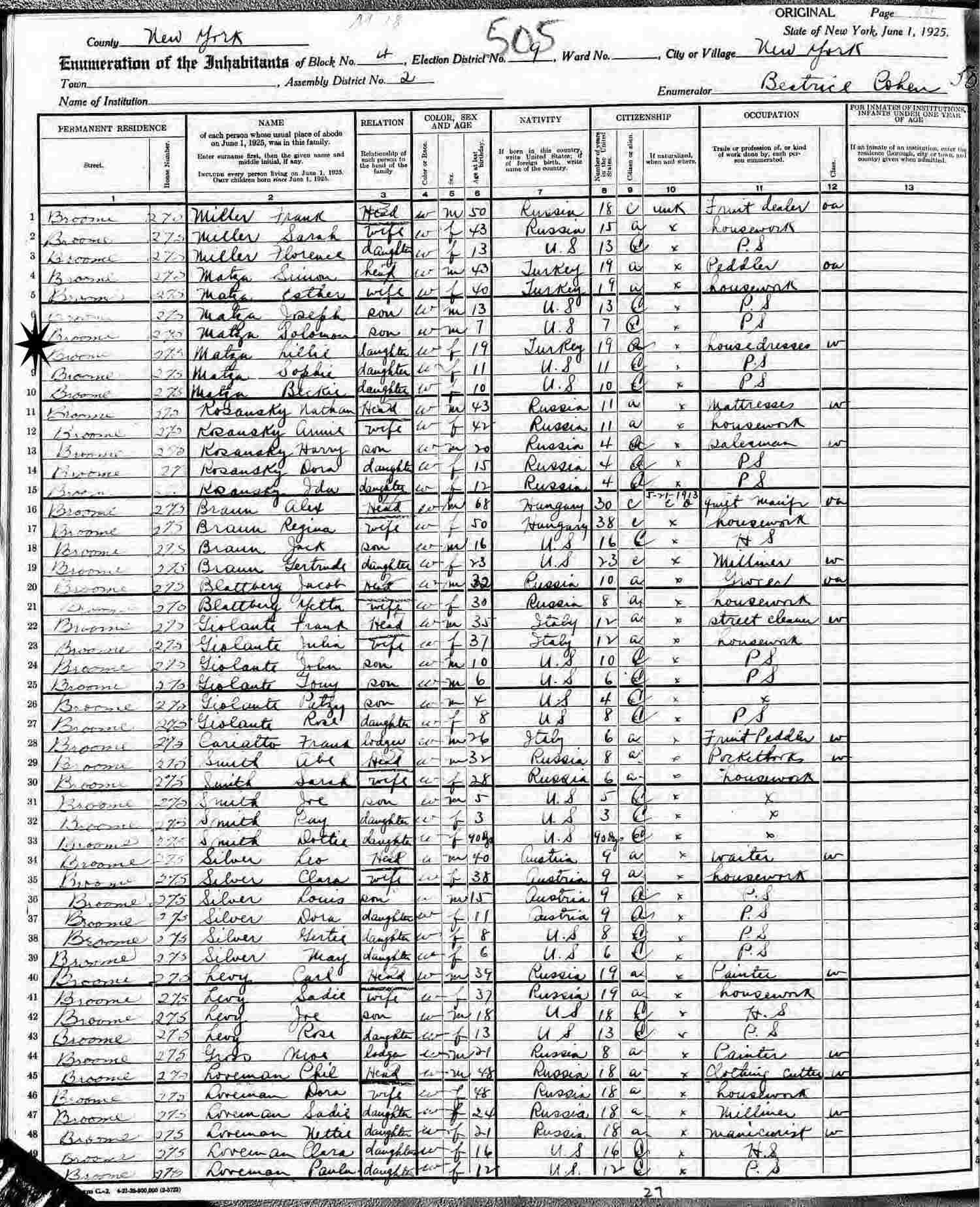 June 1, 1925 - New York State: 275 Broome Street, Block 4, Assembly District 2, Election District 9, New York, New York.