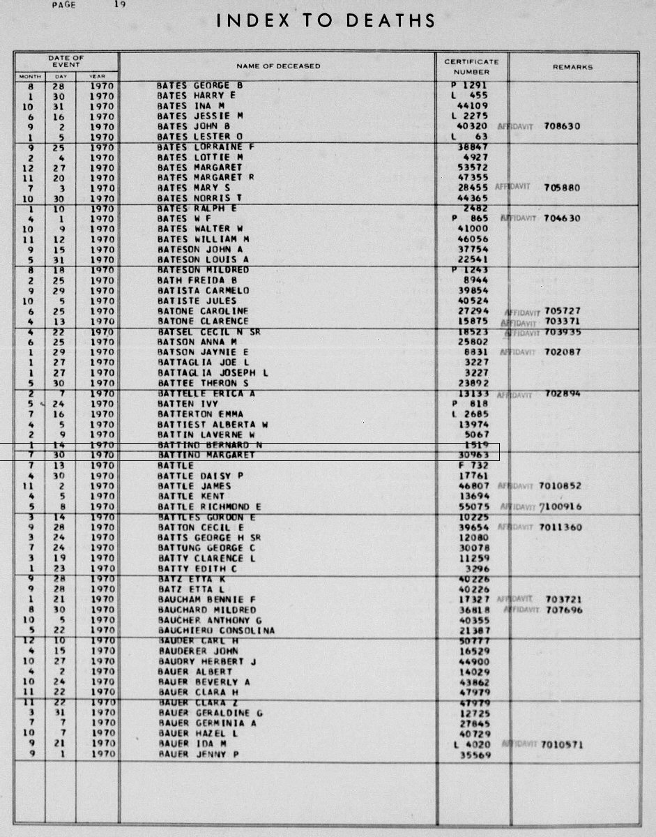 Notes for MARGARET ELLIS BATTINO: Daughter of ? and ?. Born: May 11, 1902 in Oklahoma. Died: July 30, 1970 in Los Angeles County, California.