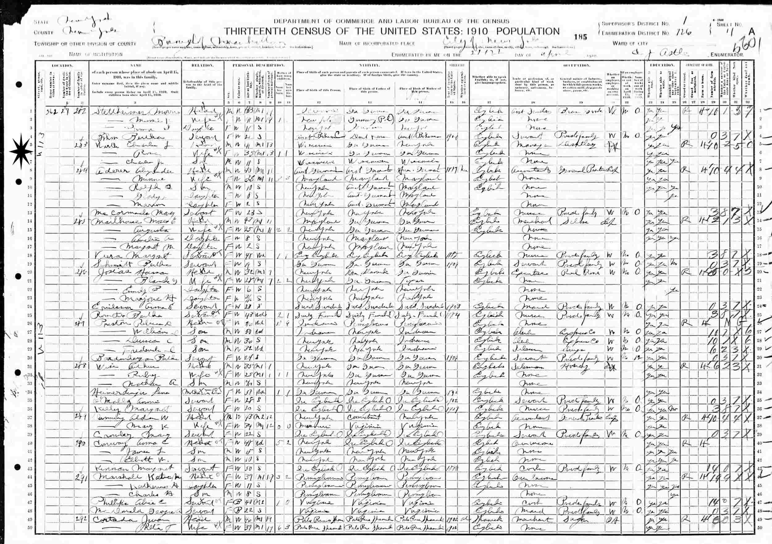April 2, 1910 - 362 W 113st, Supervisor's District 1, Enumeration District 726, Manhattan, New York City, New York, New York.