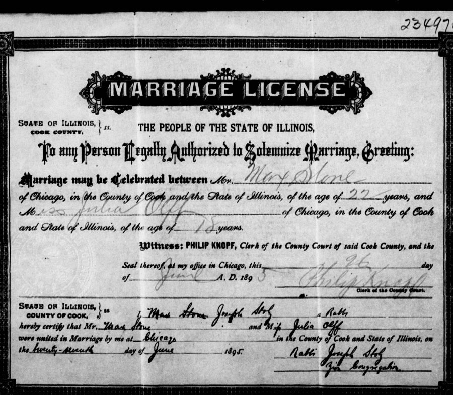 Married: Max Stone June 27, 1895 in Chicago, Cook County, Illinois
