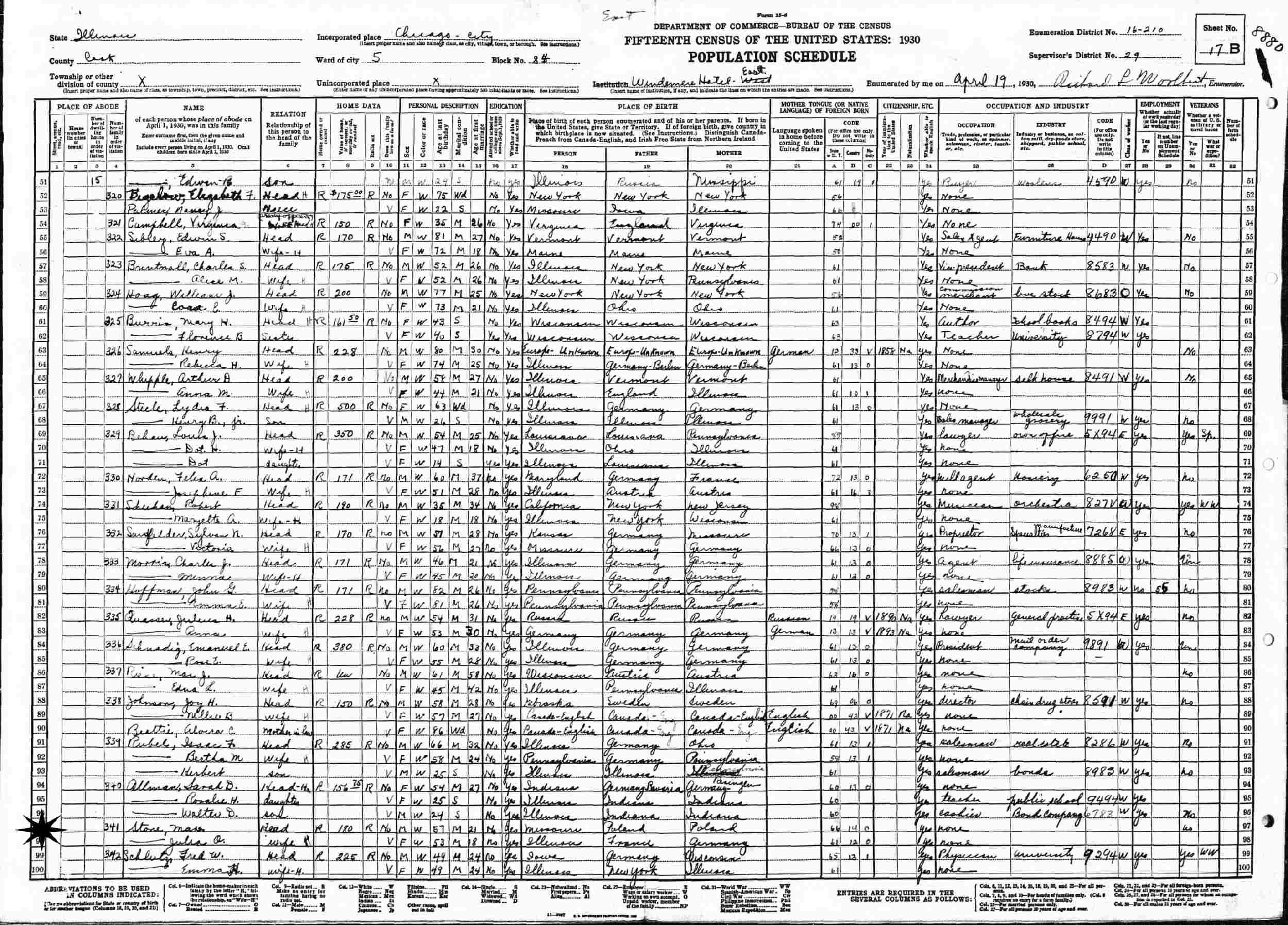 April 19, 1930 - Windermere Hotel East, Block 84, Ward 5, Supervisor's District 29, Enumeration District 16-210, Chicago, Cook County, Illinois.