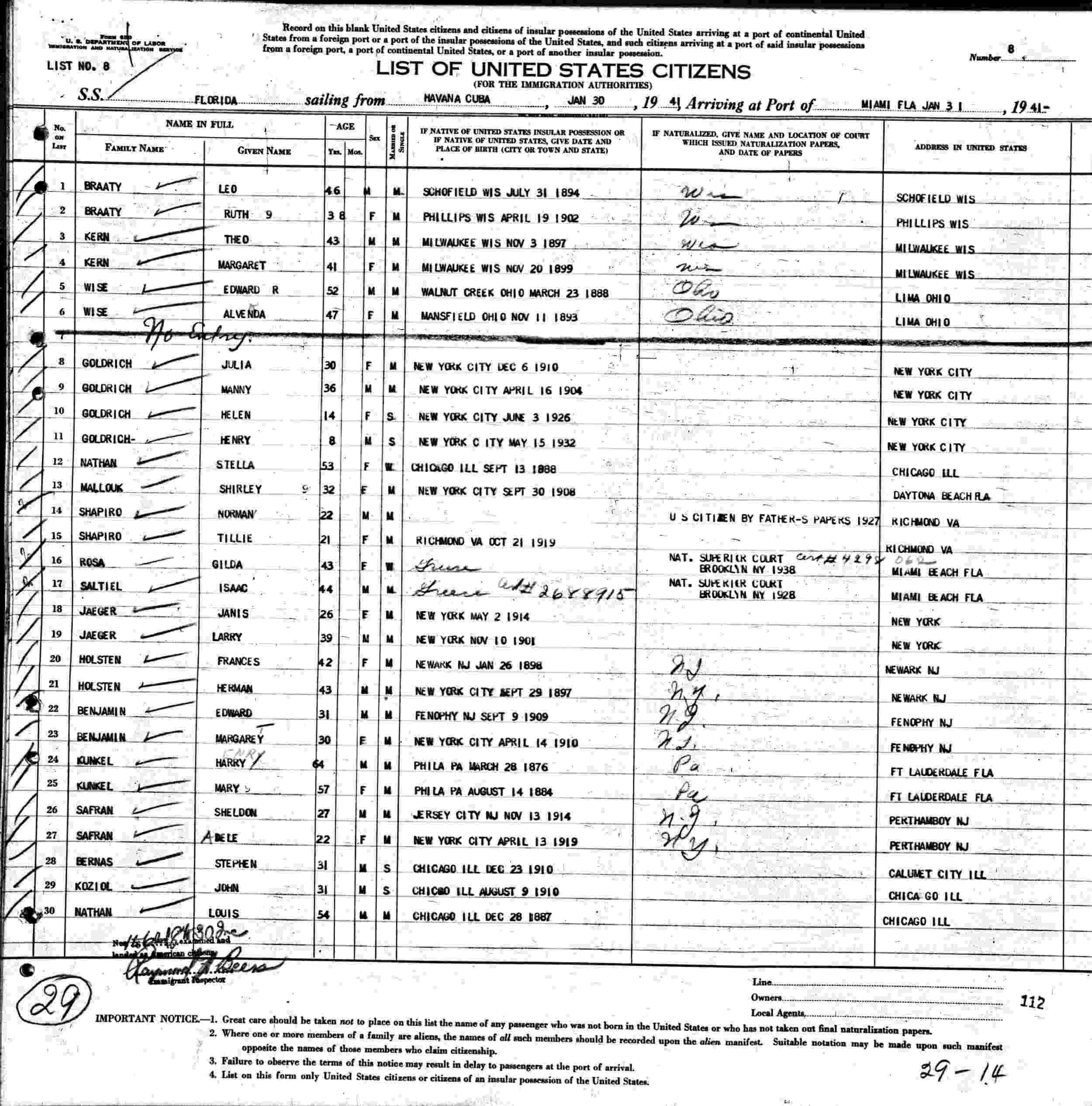 January 30, 1941-January 31, 1941 - Havana, Cuba to Miami, Florida.