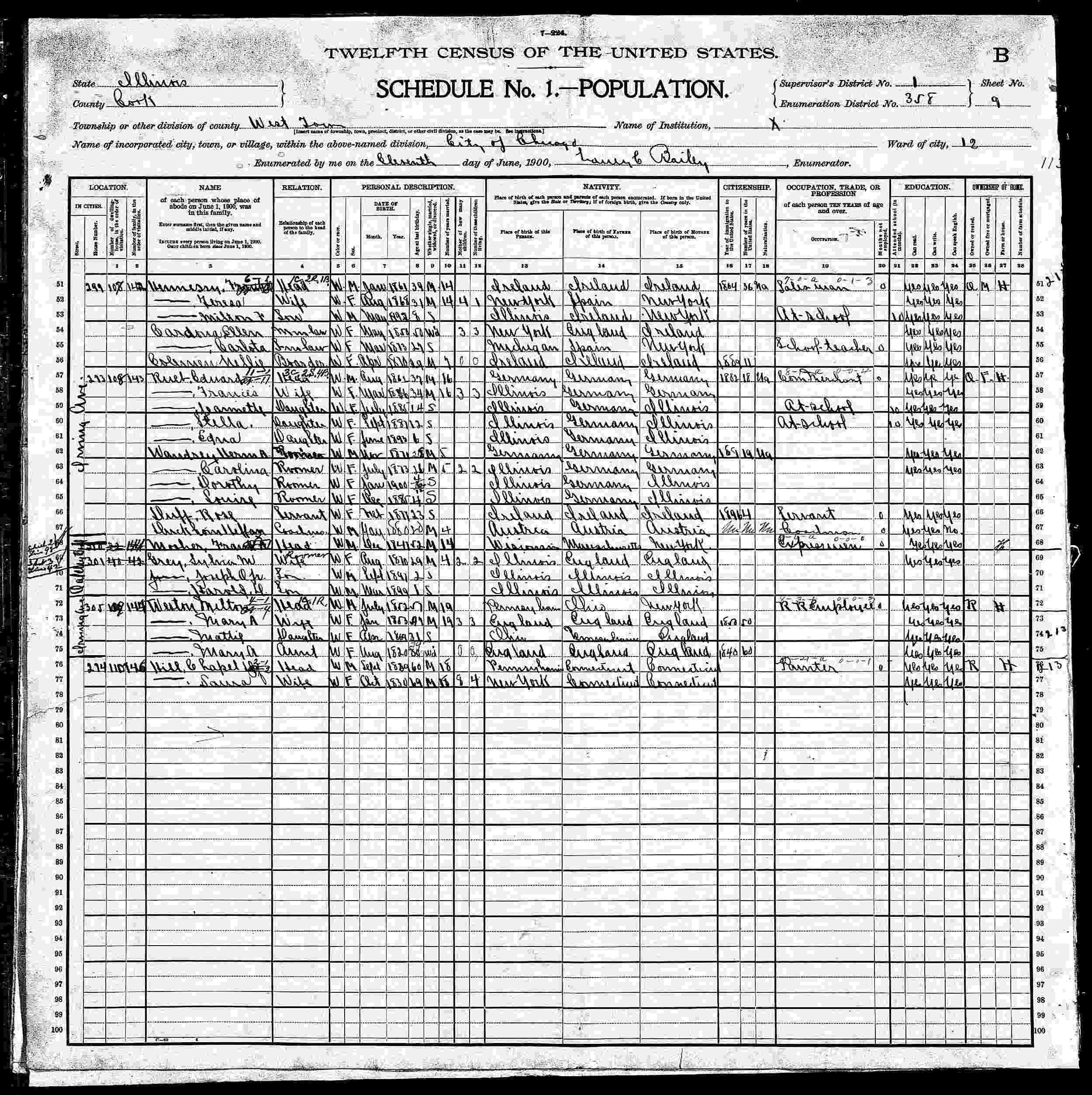 June 11, 1900 - 213 Spring Avenue, Ward 12, Supervisor's District 1, Enumeration District 358, West Town, Chicago, Cook County, Illinois.