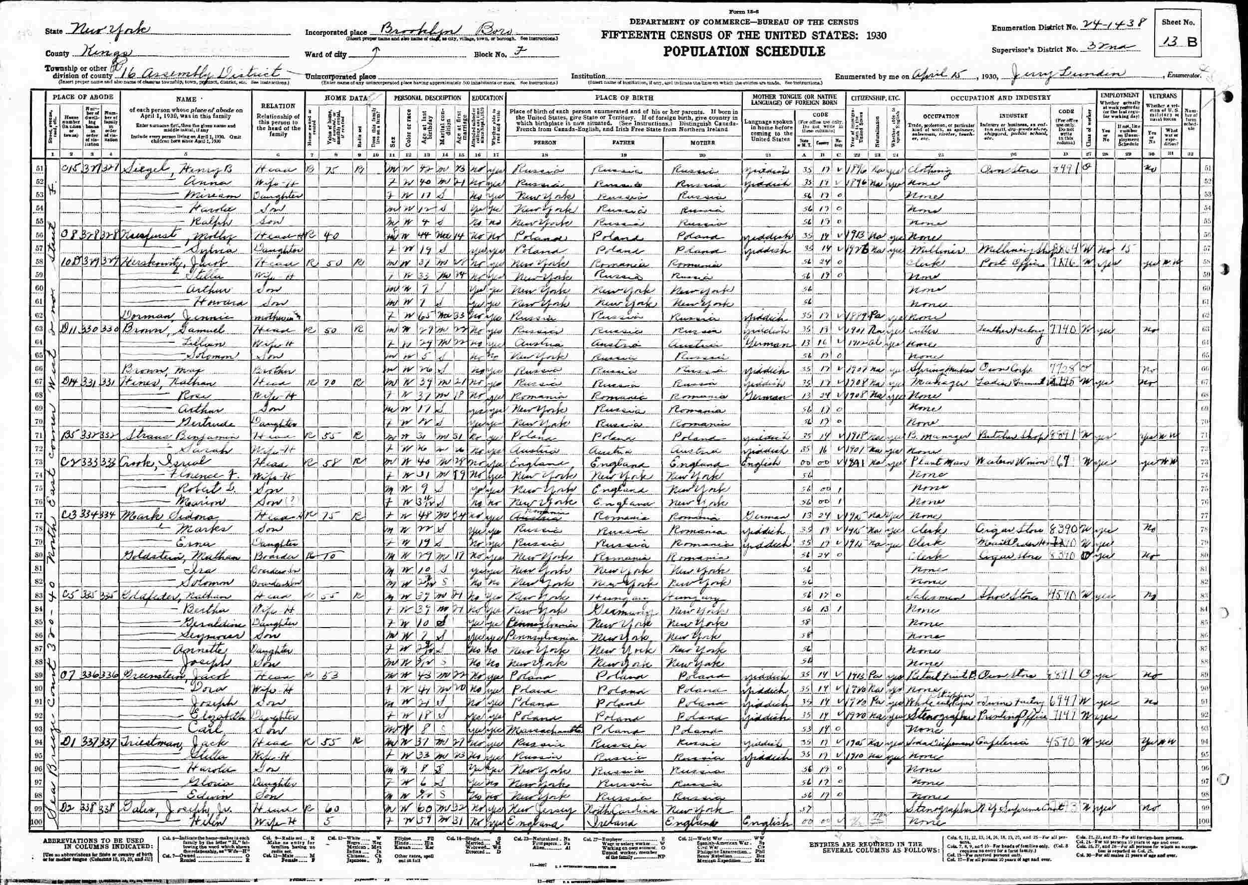 April 15, 1930 - Sea Breeze Court, B5 320-40 North East Corner, Block F, Assembly District 16, Supervisor's District 32, Enumeration District 24-1438, Brooklyn, Kings County, New York.