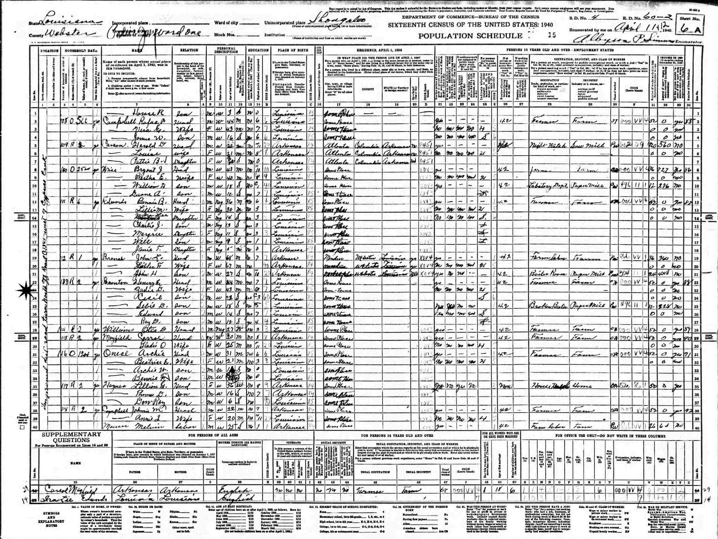 April 11-12, 1940 - Imperial District Road Trun North off Road C1345 West of Cpyress Creek, Ward 1, Supervisor's District 4, Enumeration District 60-2, Shongaloo, Webster Parish, Louisiana.