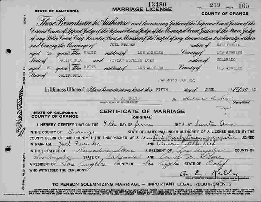 Married: Vivian Estelle Loeb June 9, 1940 in Orange County, California.