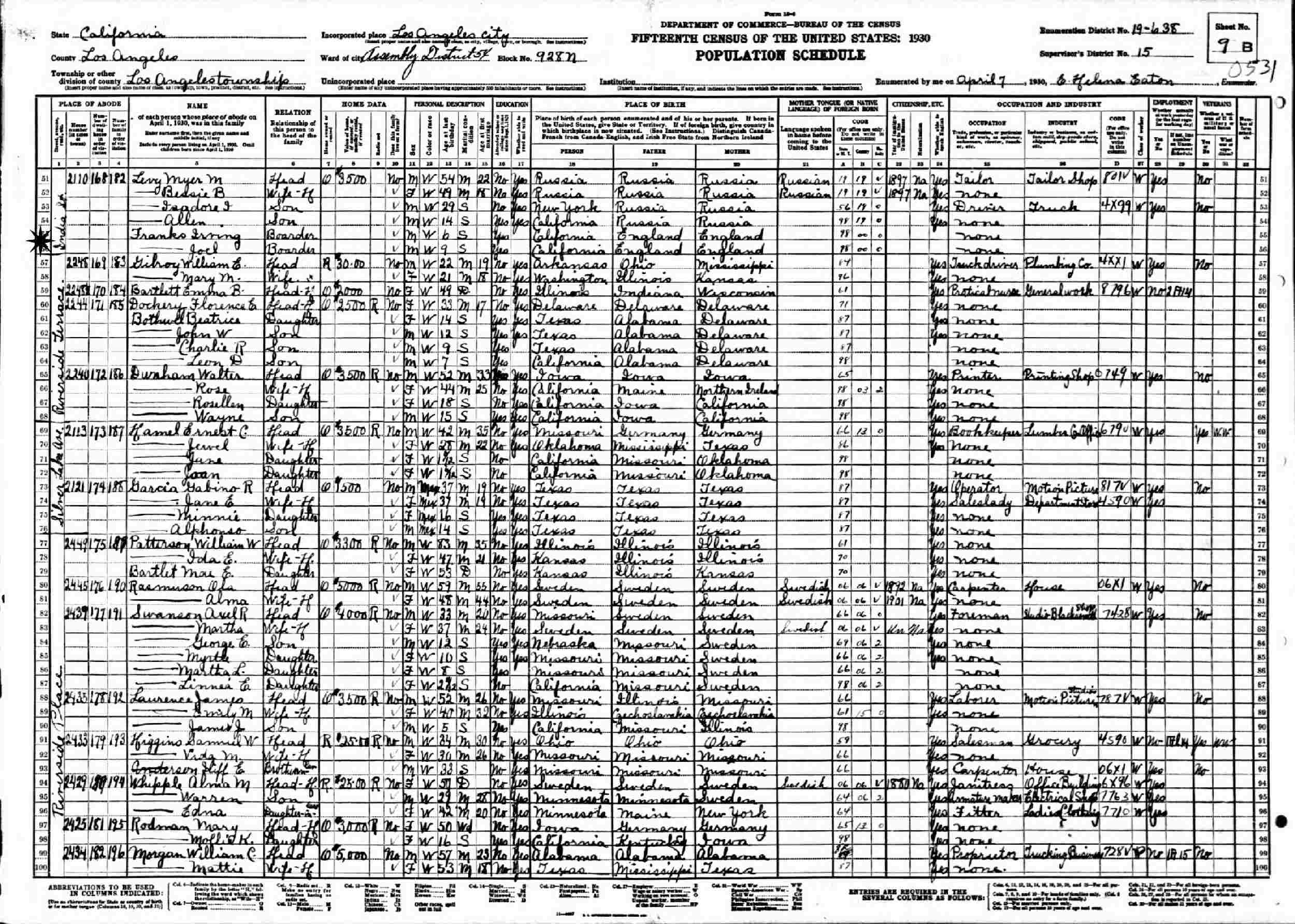 April 7, 1930 - 2110 Indian Street, Assembly District 43, Block 928N, Supervisor's District 15, Enumeration District 19-638, Los Angeles, Los Angeles County, Calfiornia (boarder w/brother Irving w/Levy family).